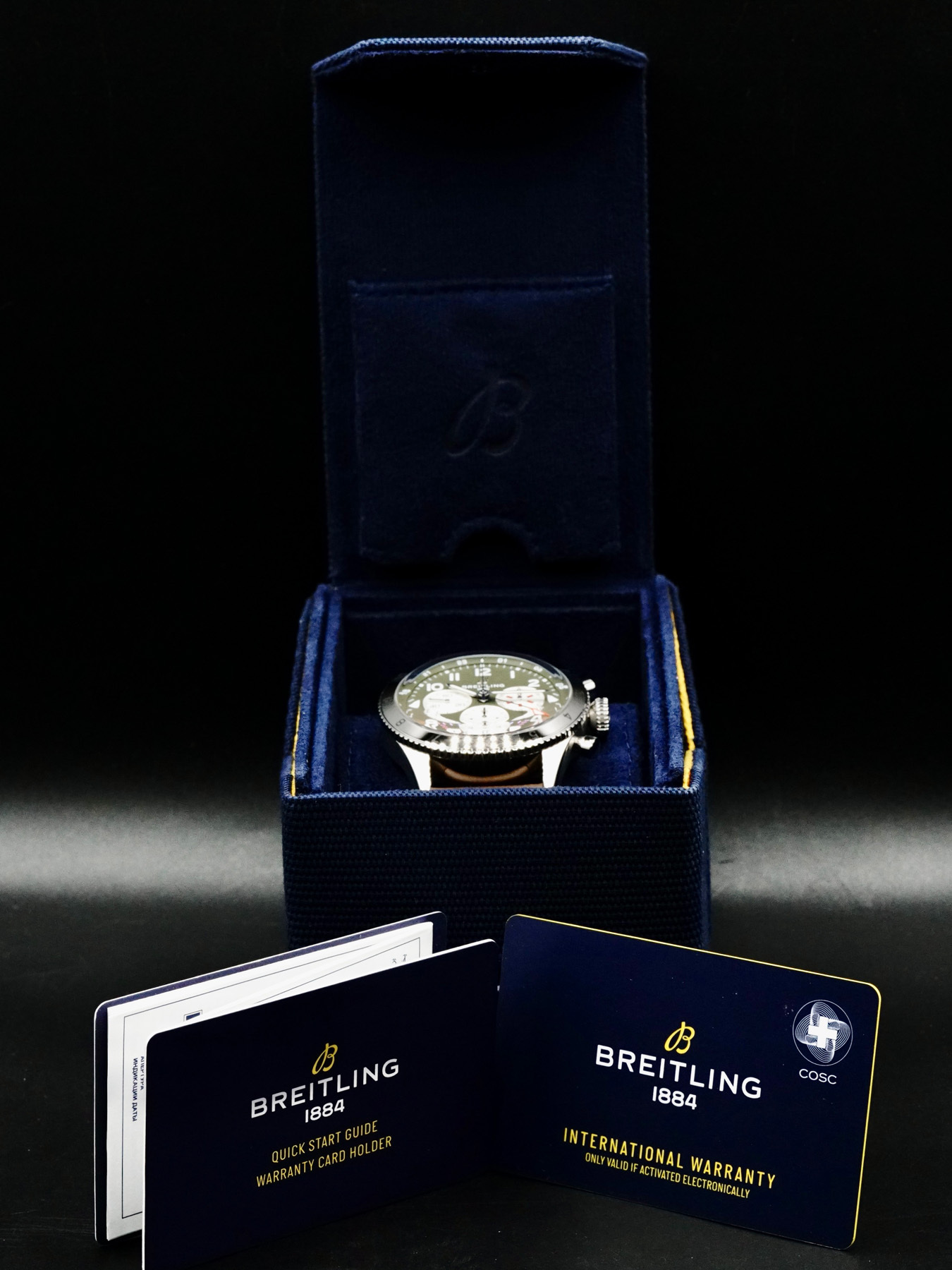 This Breitling Super Avi B04 Chronograph GMT Curtiss Warhawk AB0445 is in EXCELLENT condition. This watch includes its original box, quick start guide, and international warranty card. No date on warranty card.