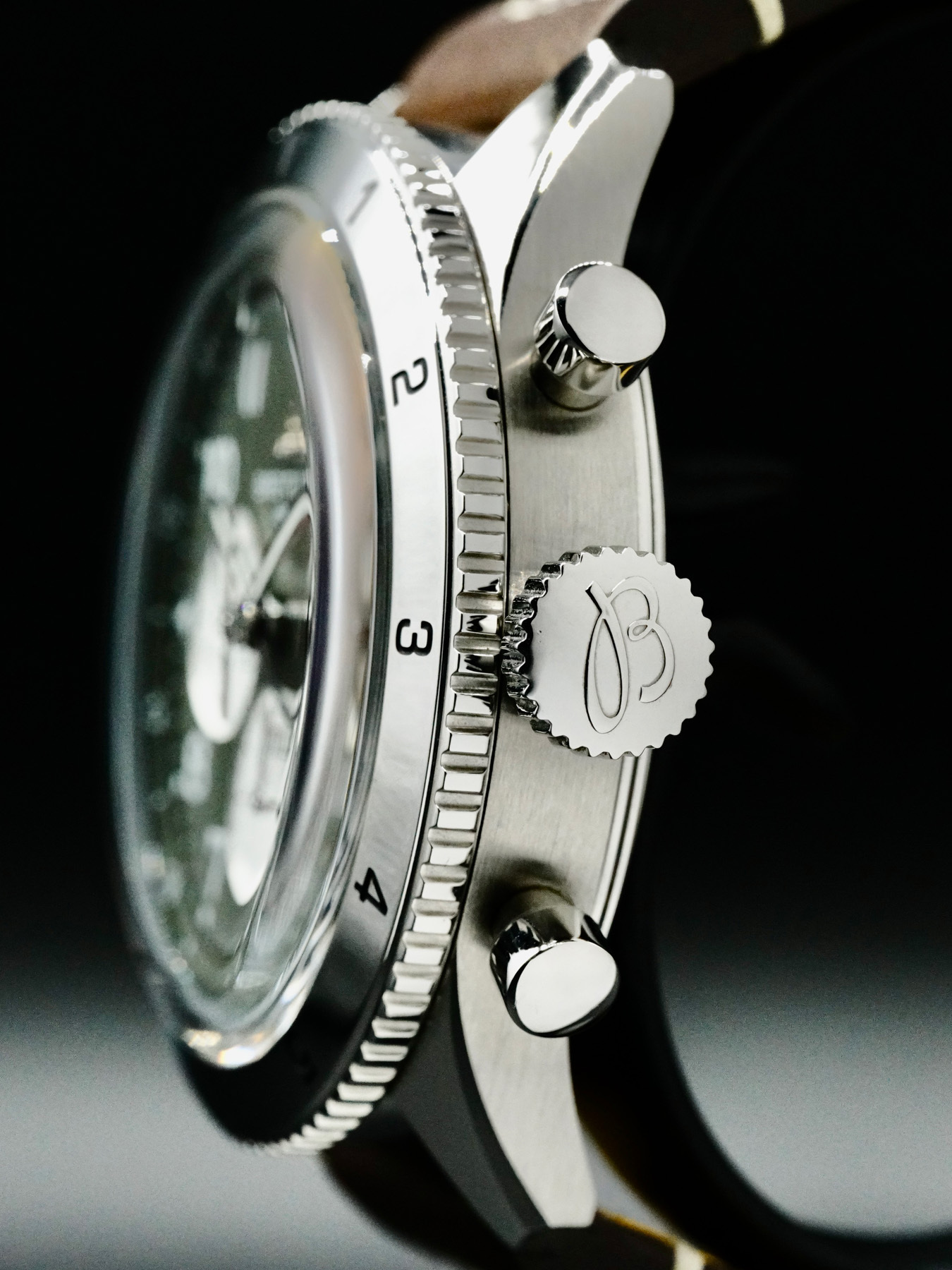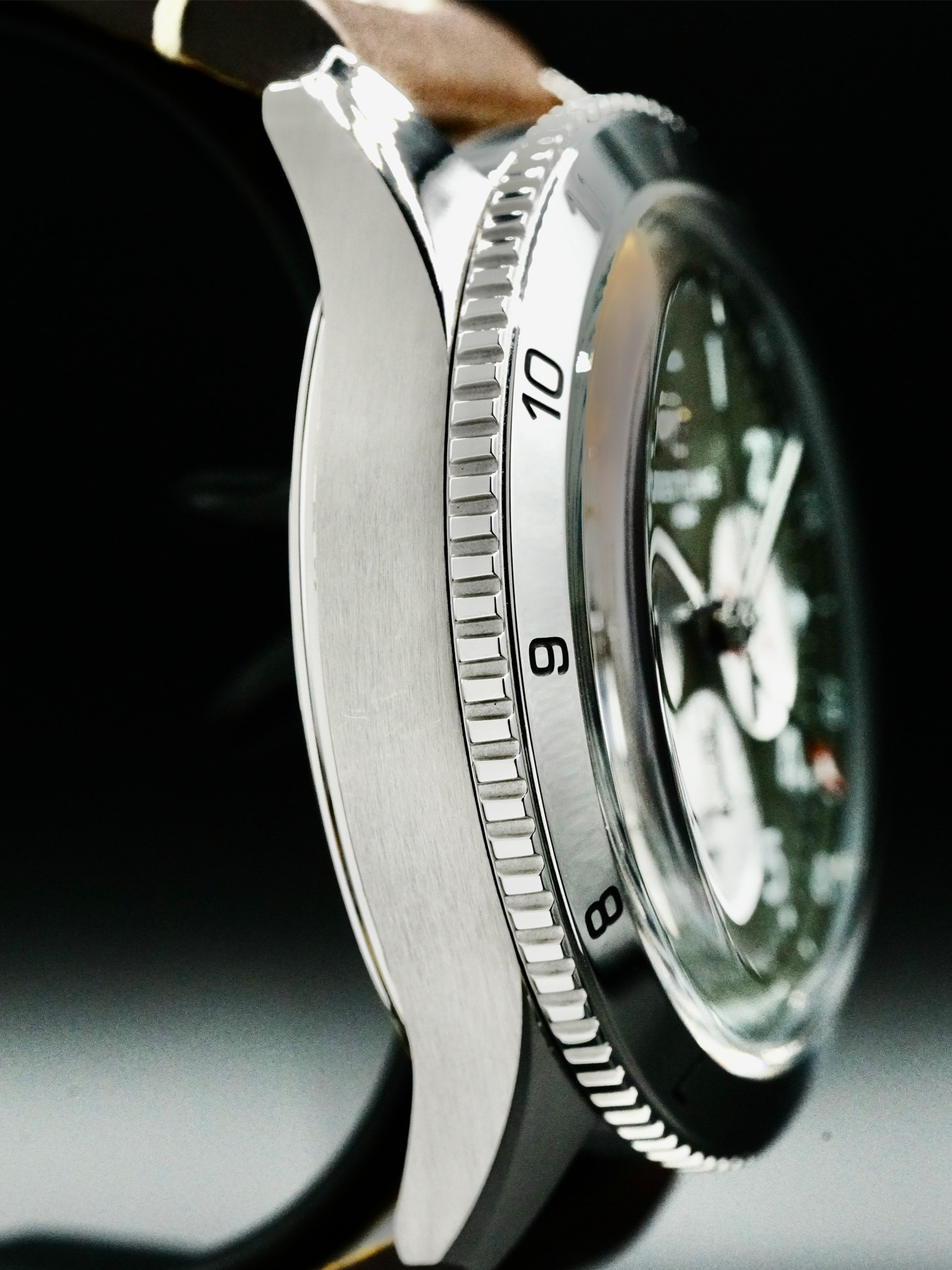 This Breitling Super Avi features a 46mm stainless steel case with a display case back on a brown leather strap. This watch also sports a green dial with luminous hands and Arabic numeral dial markers covered by scratch resistant sapphire crystal.