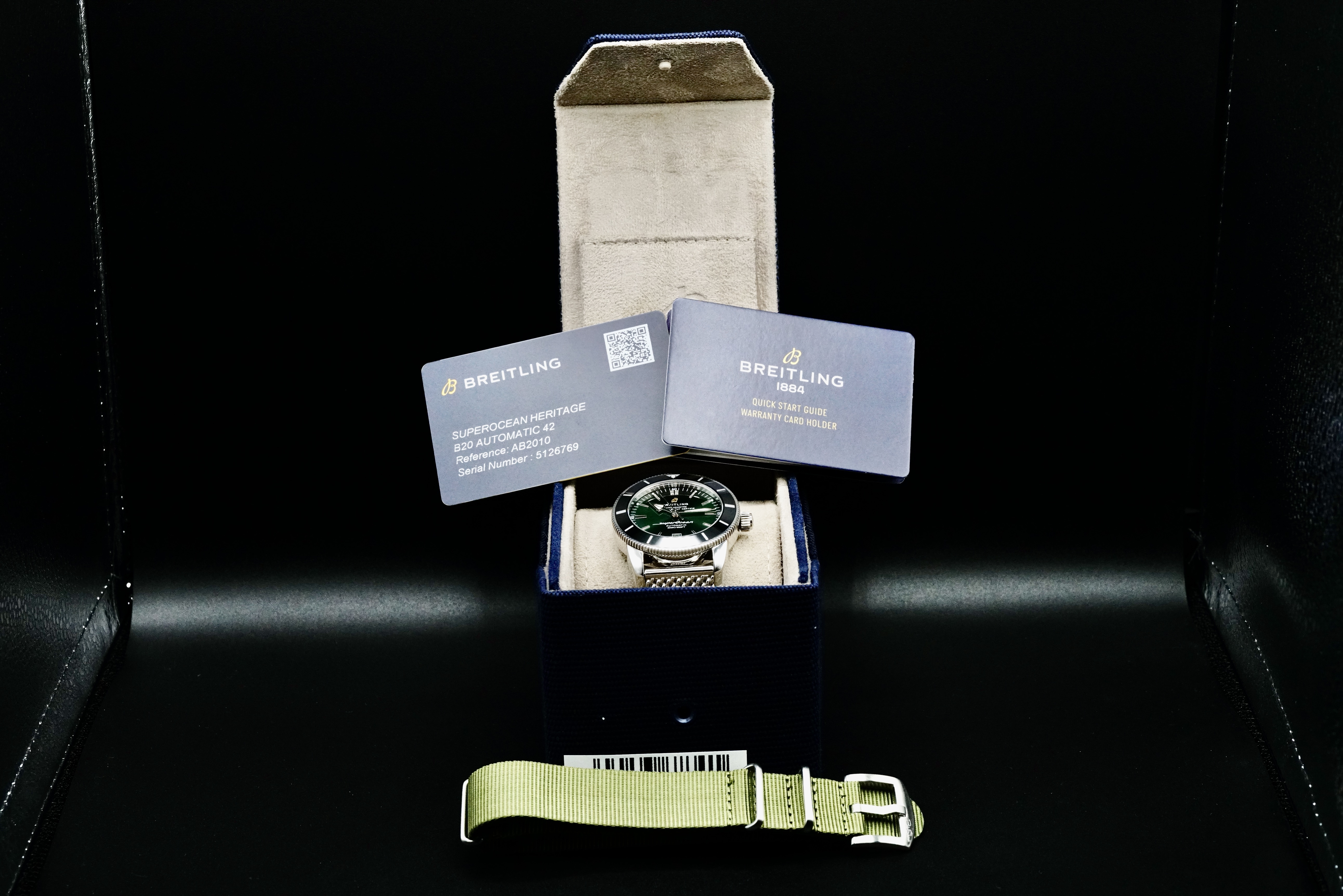 This Breitling AB2010 Superocean Heritage B20 Automatic 42 is in EXCELLENT condition. This watch includes its original box, instruction booklet, and warranty card not dated. Extra green NATO strap & stainless steel bracelet link. This watch has been fully authenticated and certified by Exquisite Timepieces.