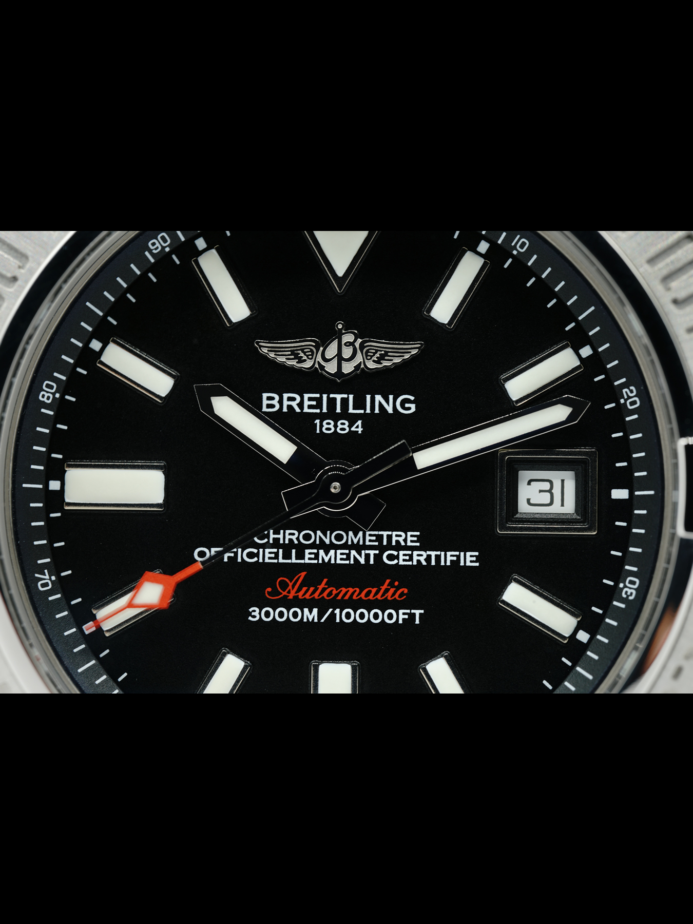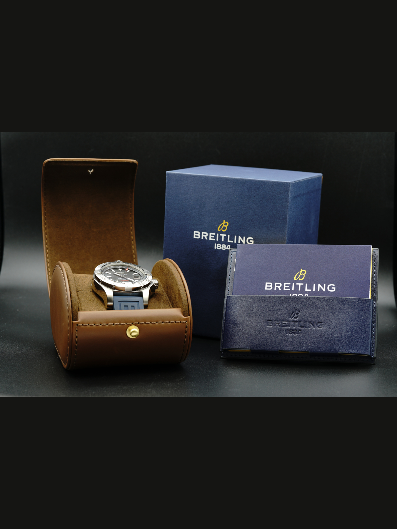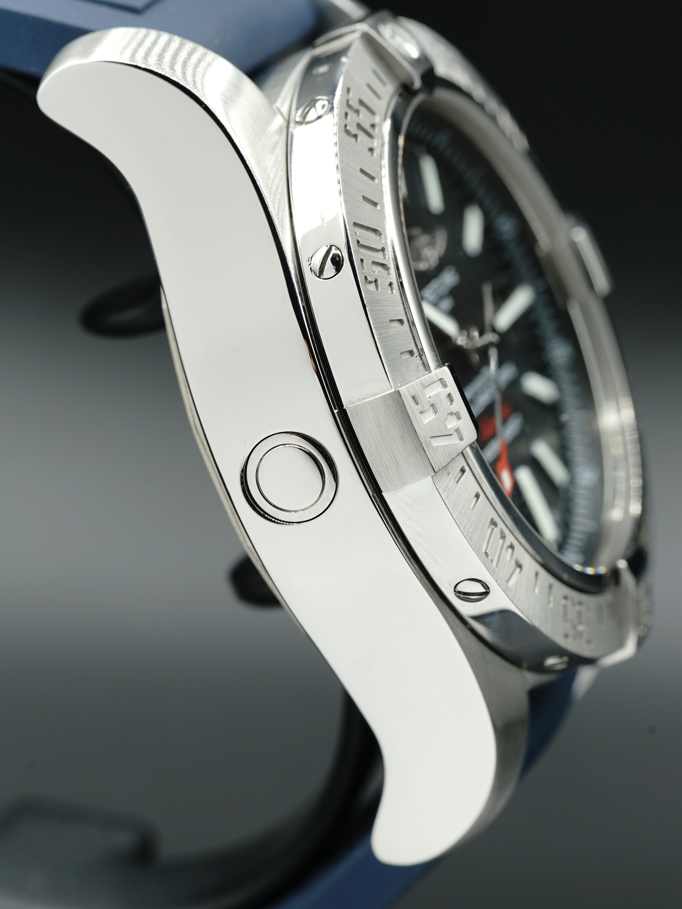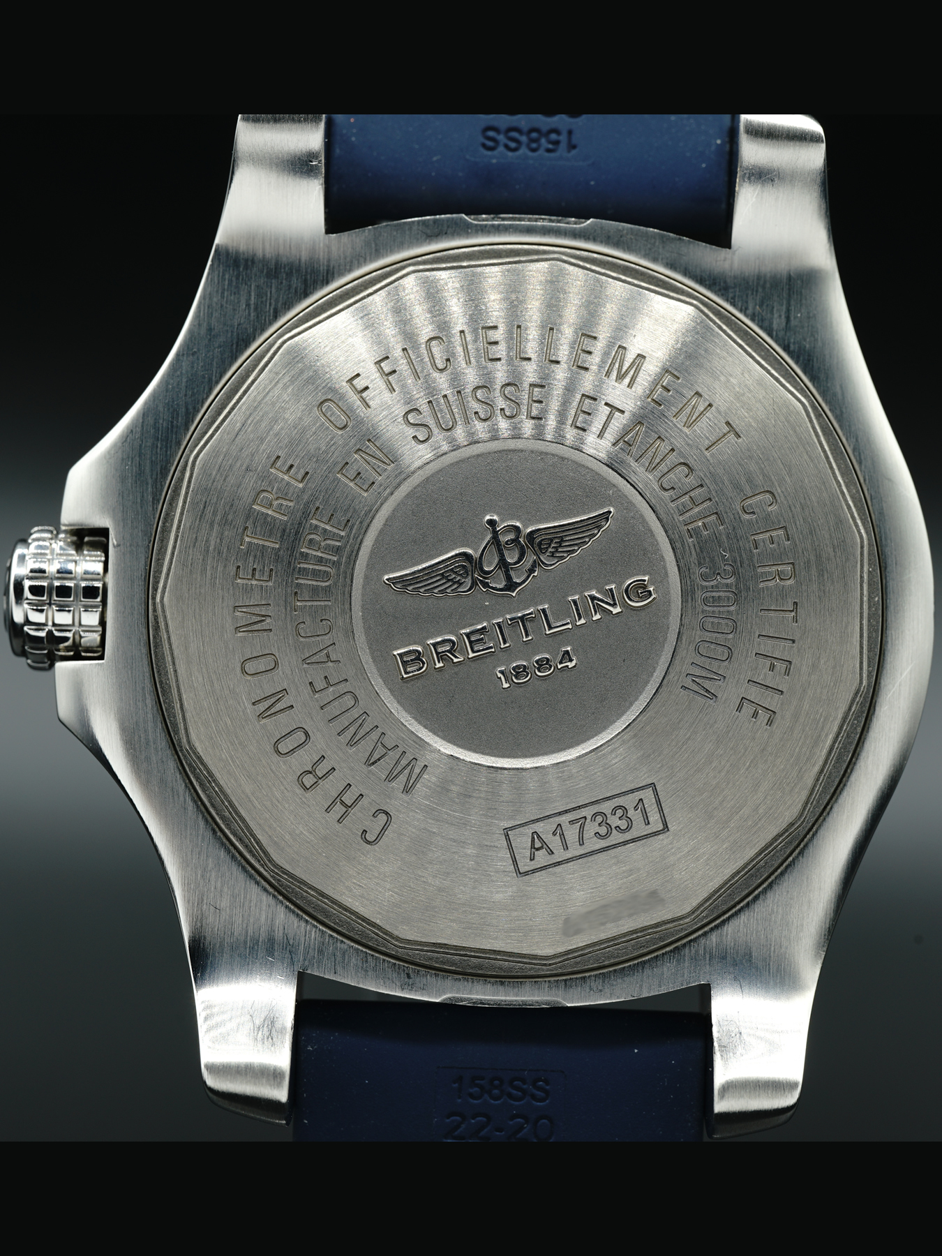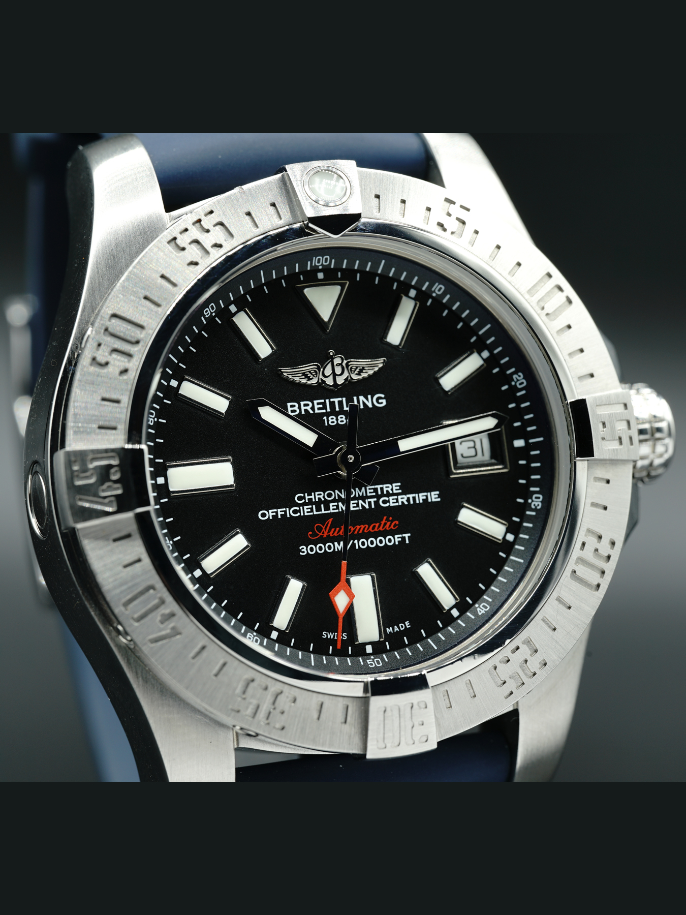 This Breitling Avenger II Seawolf Automatic Watch is in FANTASTIC condition. This watch features a stainless steel case with a blue rubber strap. Uni directional rotating stainless steel bezel. Black dial with luminous silver-tone hands and index hour markers. This watch includes its original box, papers, and warranty dated for December 2019.