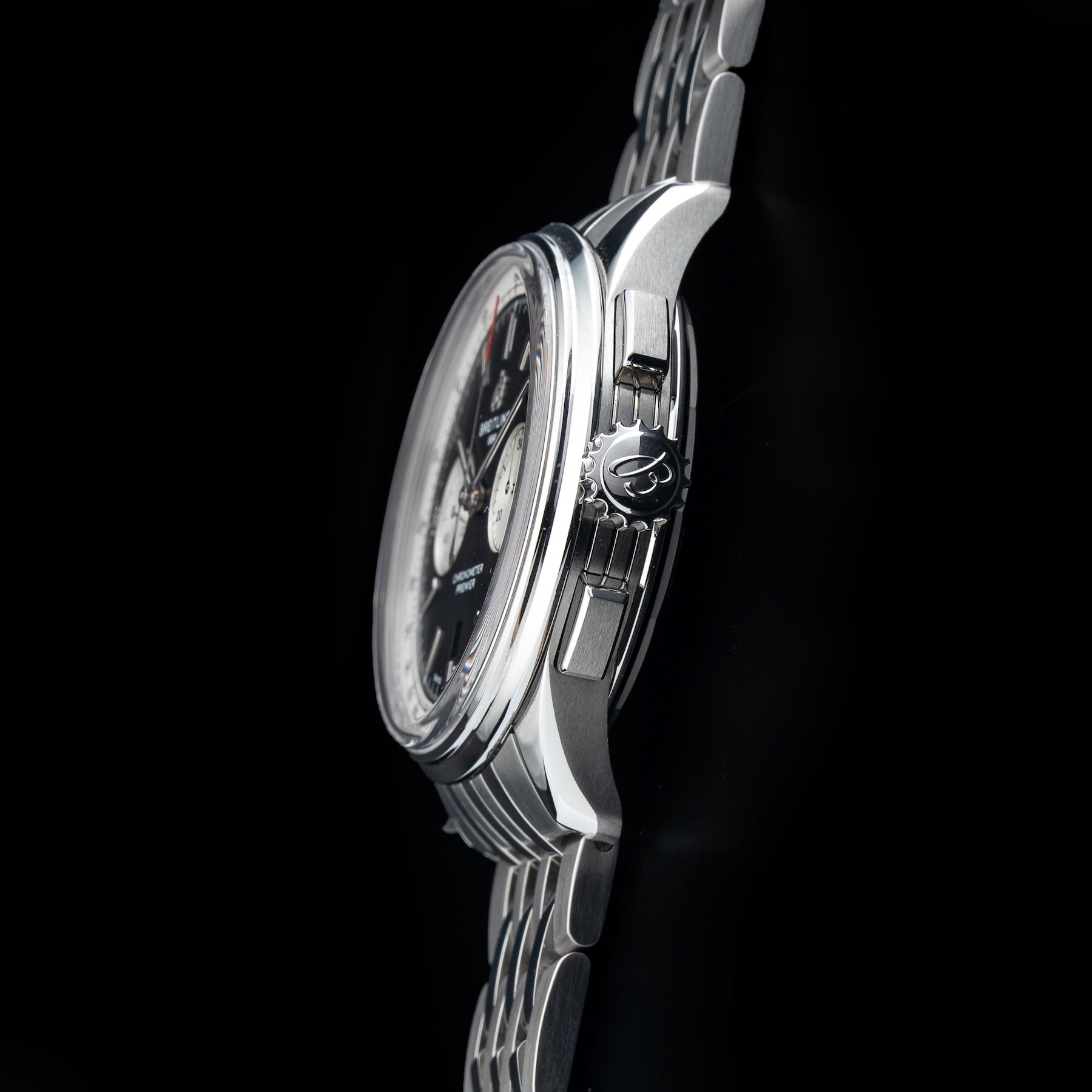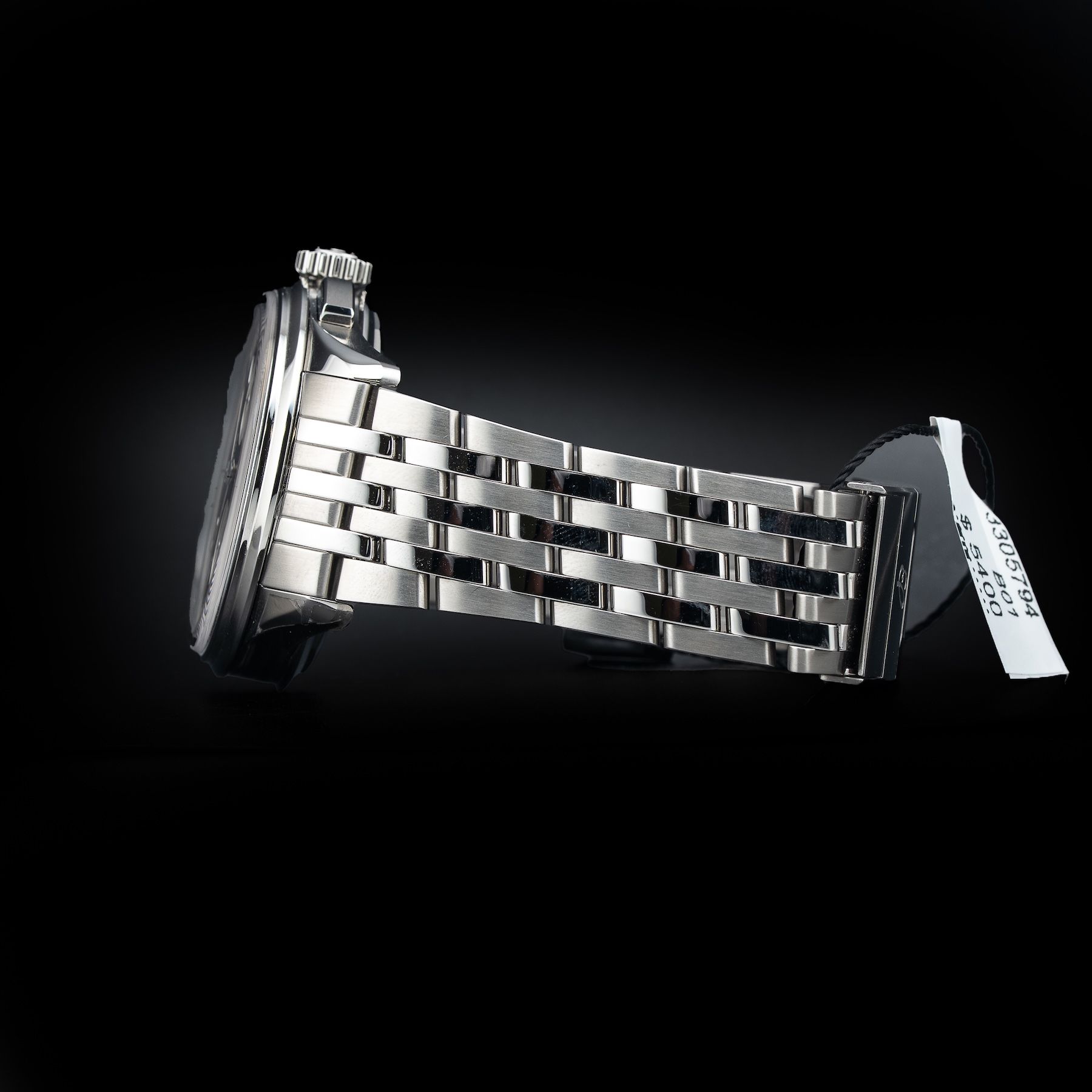 This watch features a 42mm stainless steel case on stainless steel bracelet. This watch also sports a black dial. Powered by a self-winding mechanical movement. Water resistance up to 100 meters.