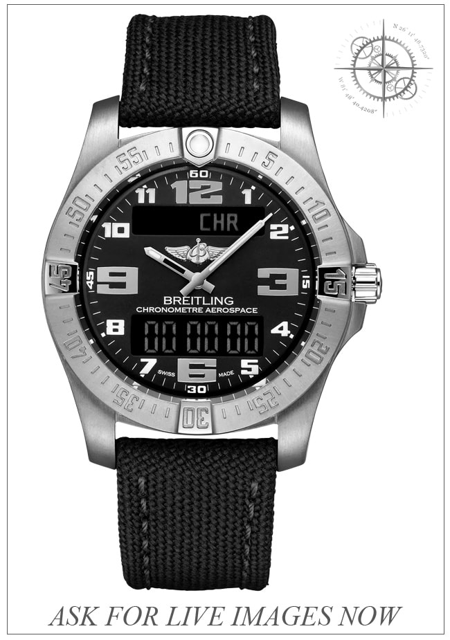 This watch features a 43mm titanium case on fabric strap. This watch also sports a black dial. Powered by a Breitling 79 SuperQuartz™ movement. Water resistance up to 100 meters.