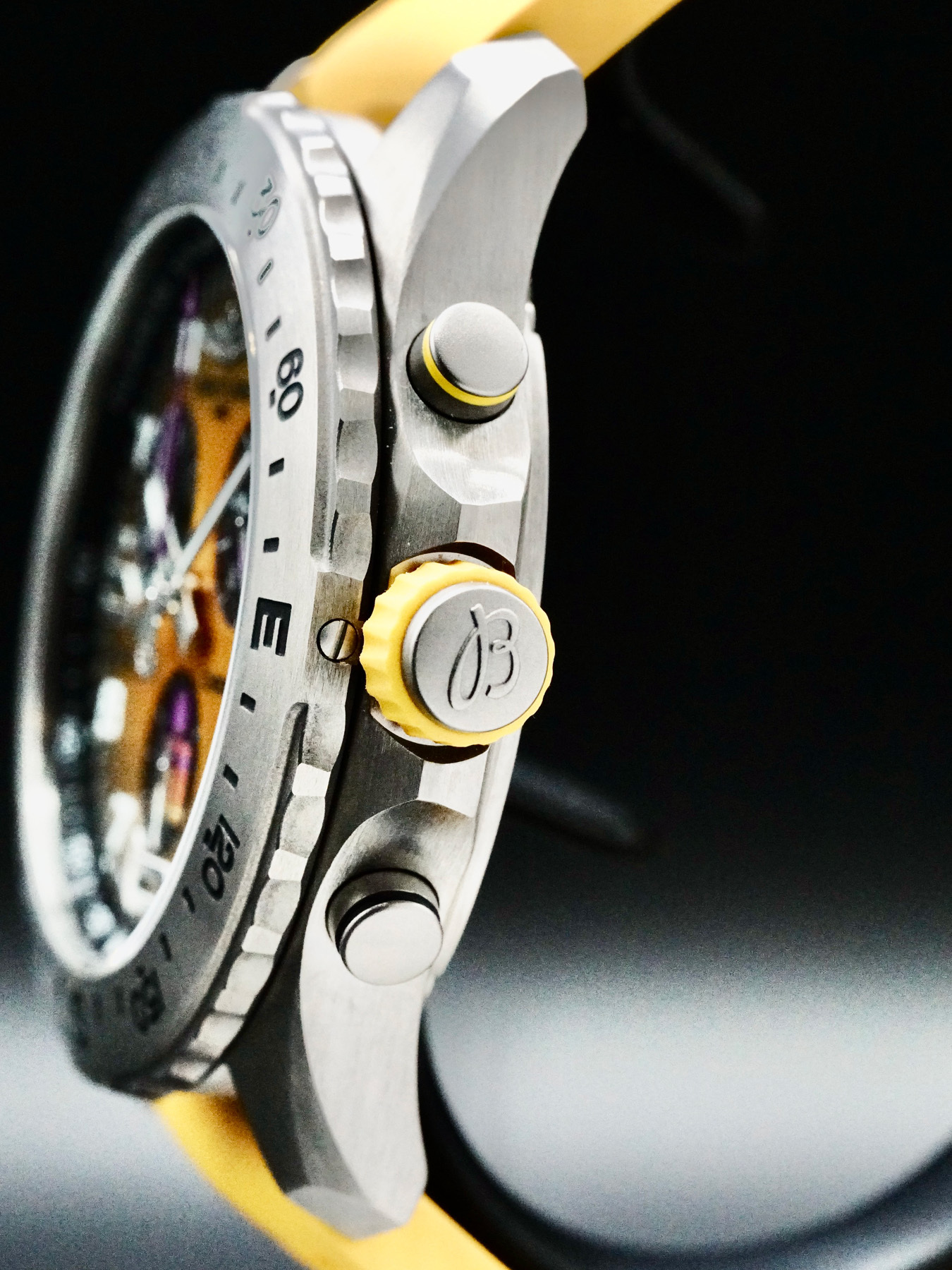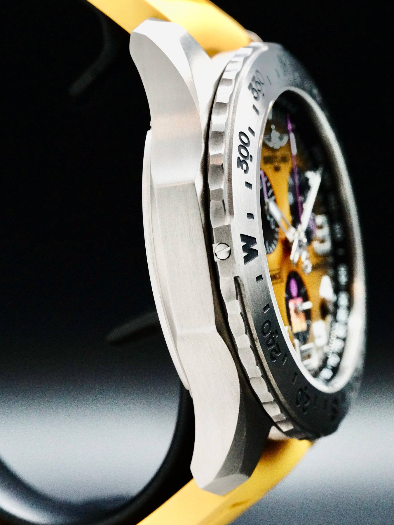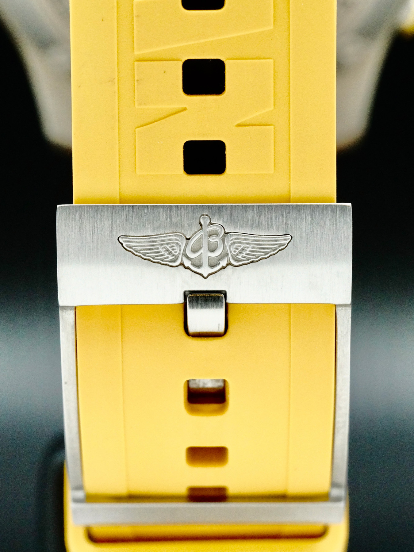 This Breitling Endurance Pro Ironman World Championship features a 44mm titanium case with a solid case back on a yellow rubber strap. This watch also sports a yellow dial with luminous hands and Arabic numeral dial markers covered by scratch resistant sapphire crystal.