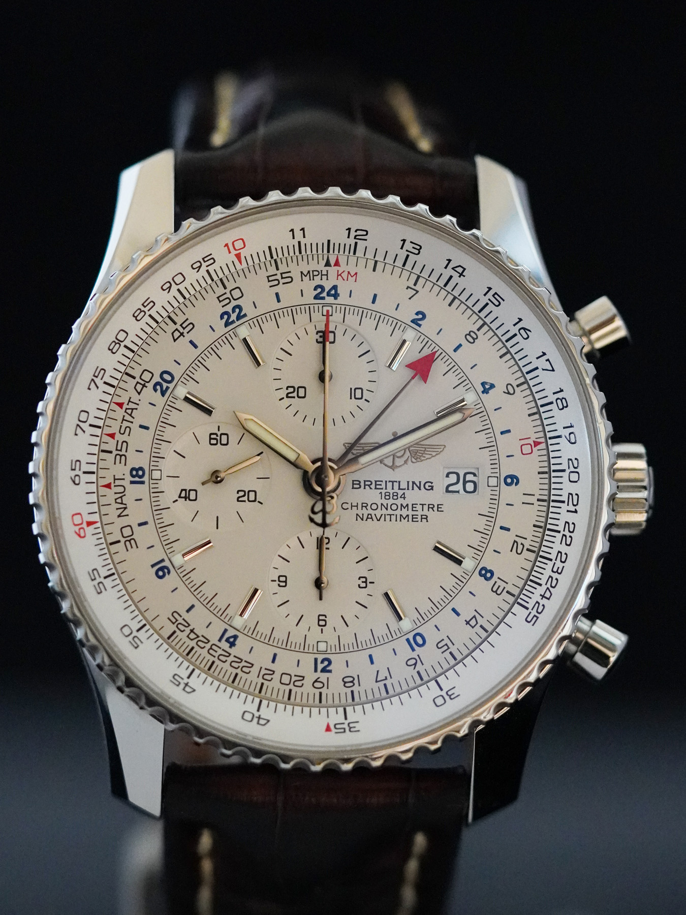 This watch features a 46 mm steel case on leather strap. This watch also sports a silver dial. Powered by a Breitling 24 automatic movement. Water resistance up to 30 meters.
