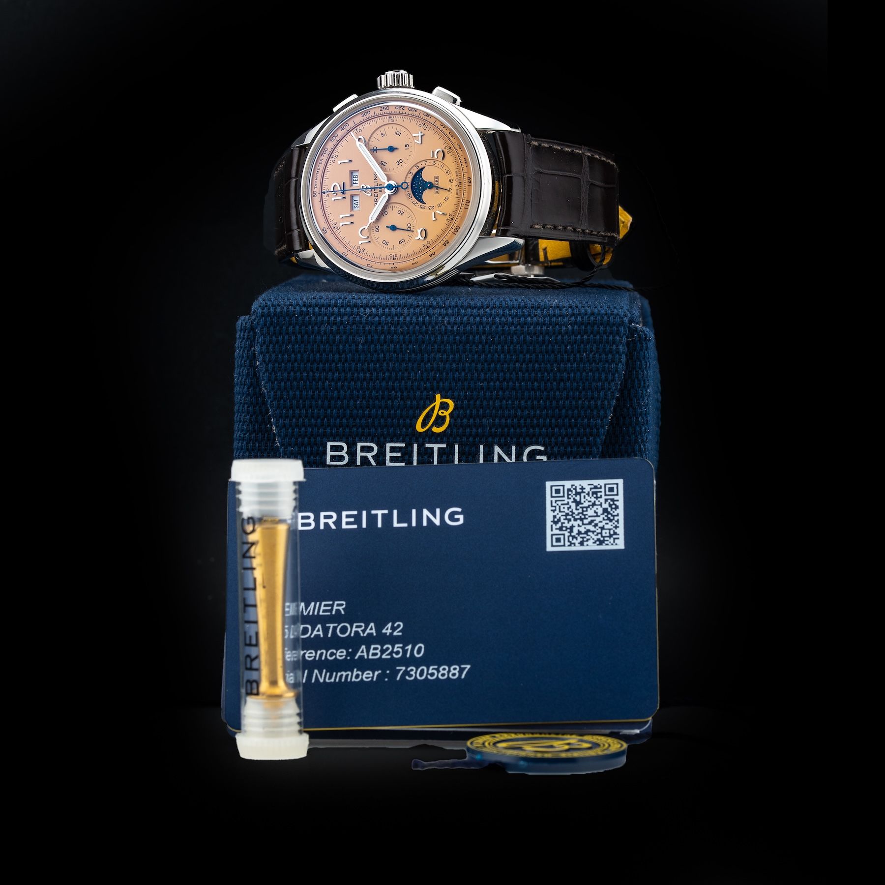 This Breitling Premier B25 Datora 42 AB2510 is in GREAT condition. This watch includes its Original Box, Original Papers. This watch has been fully authenticated and certified by Exquisite Timepieces. Please note, the photos shown are of the actual watch you will receive.