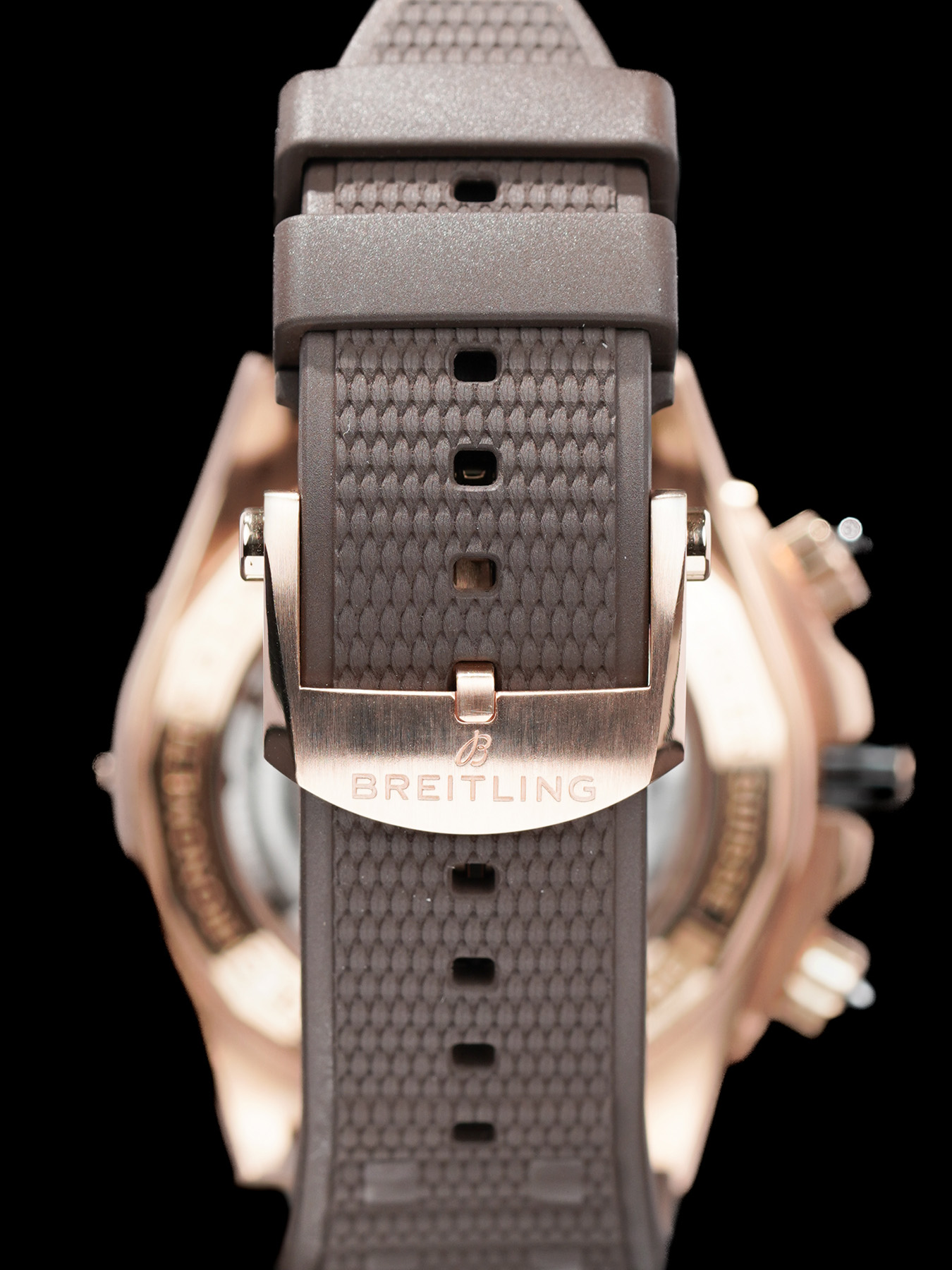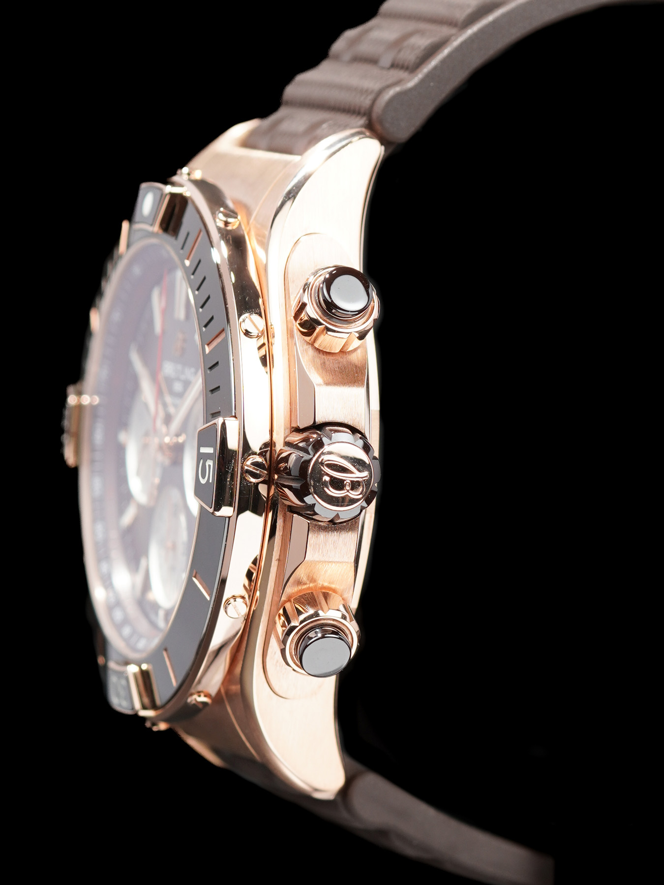 This watch features a 44mm 18k red gold case on rubber strap. This watch also sports a brown dial. Powered by a self-winding mechanical movement. Water resistance up to 200 meters.
