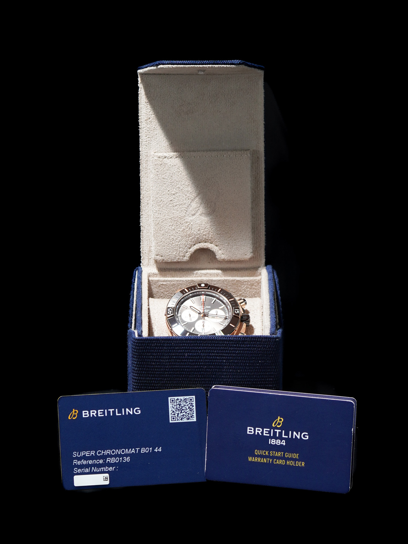 This Breitling RB0136 Super Chronomat B01 44 is in EXCELLENT condition. This watch includes its Original Box, Original Papers and warranty valid until 28/03/2028. This watch has been fully authenticated and certified by Exquisite Timepieces.