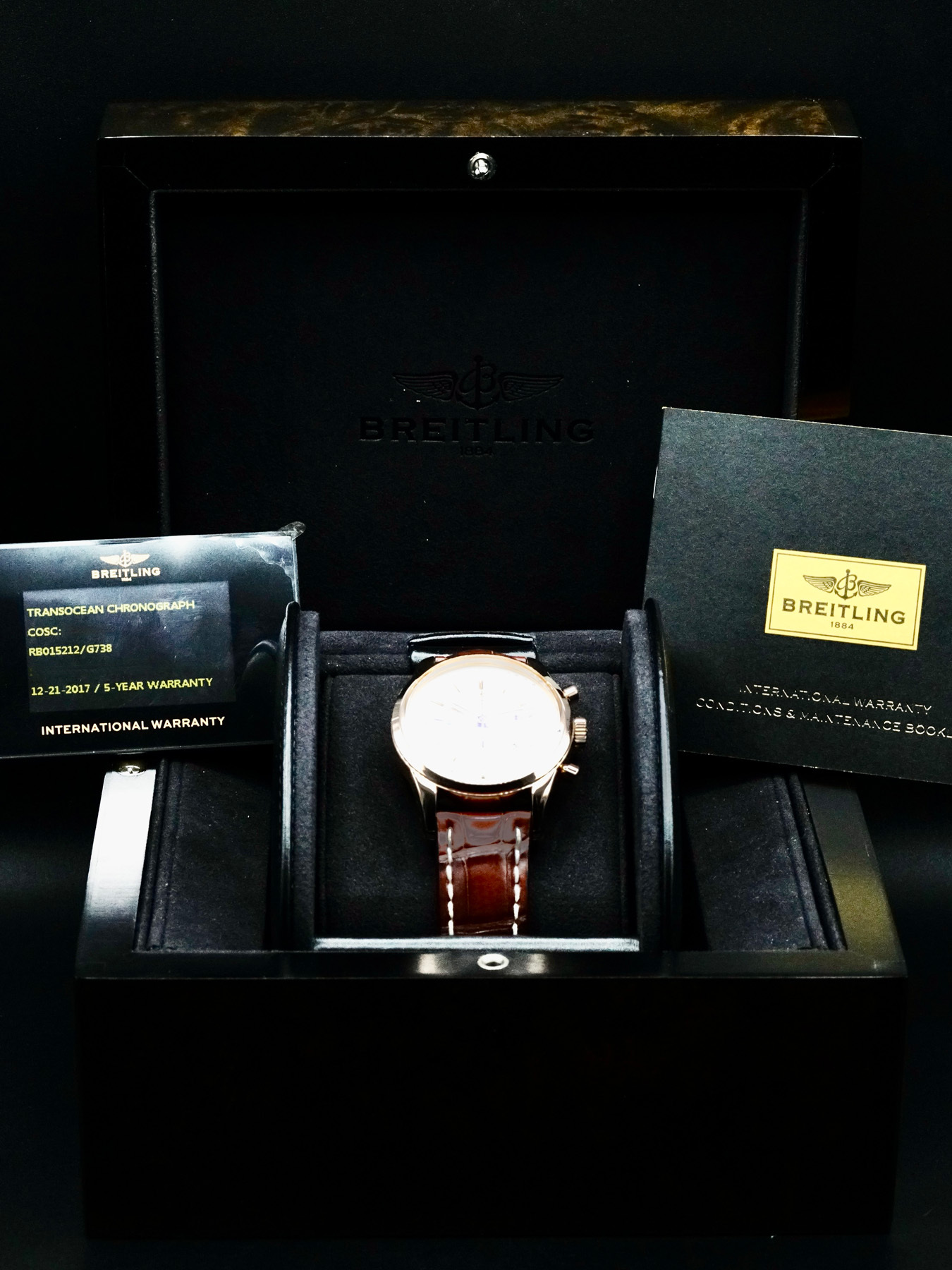 This Breitling Transocean Chronograph RB015212/G738 is in EXCELLENT condition. This watch includes its original box, instruction manual, and warranty card dated for 2017. This watch has been fully authenticated and certified by Exquisite Timepieces.