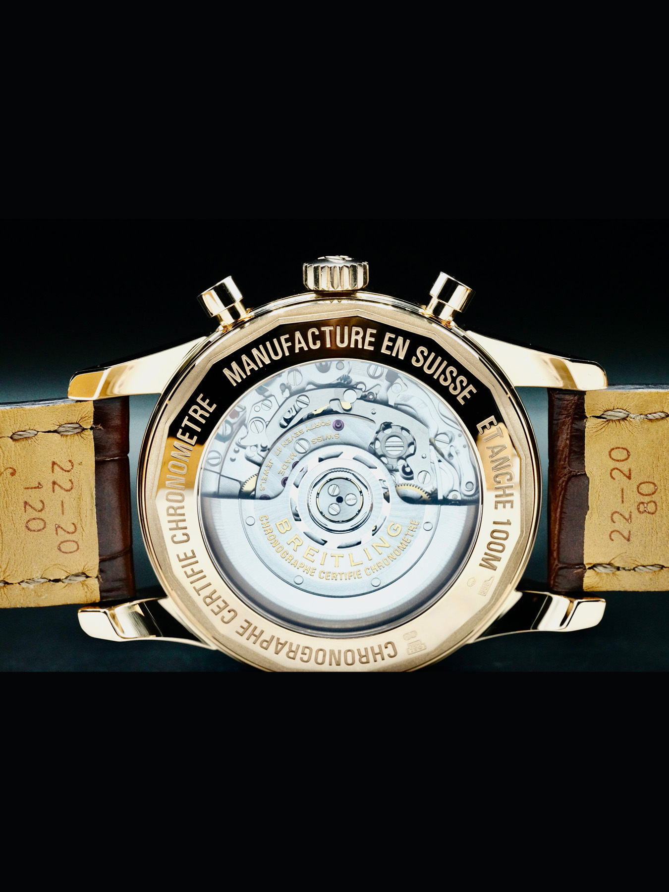 Self-winding Automatic movement powered by Breitling In-House Caliber 01 with a power reserve of approximately 70 hours. Water resistance up to 100 meters.