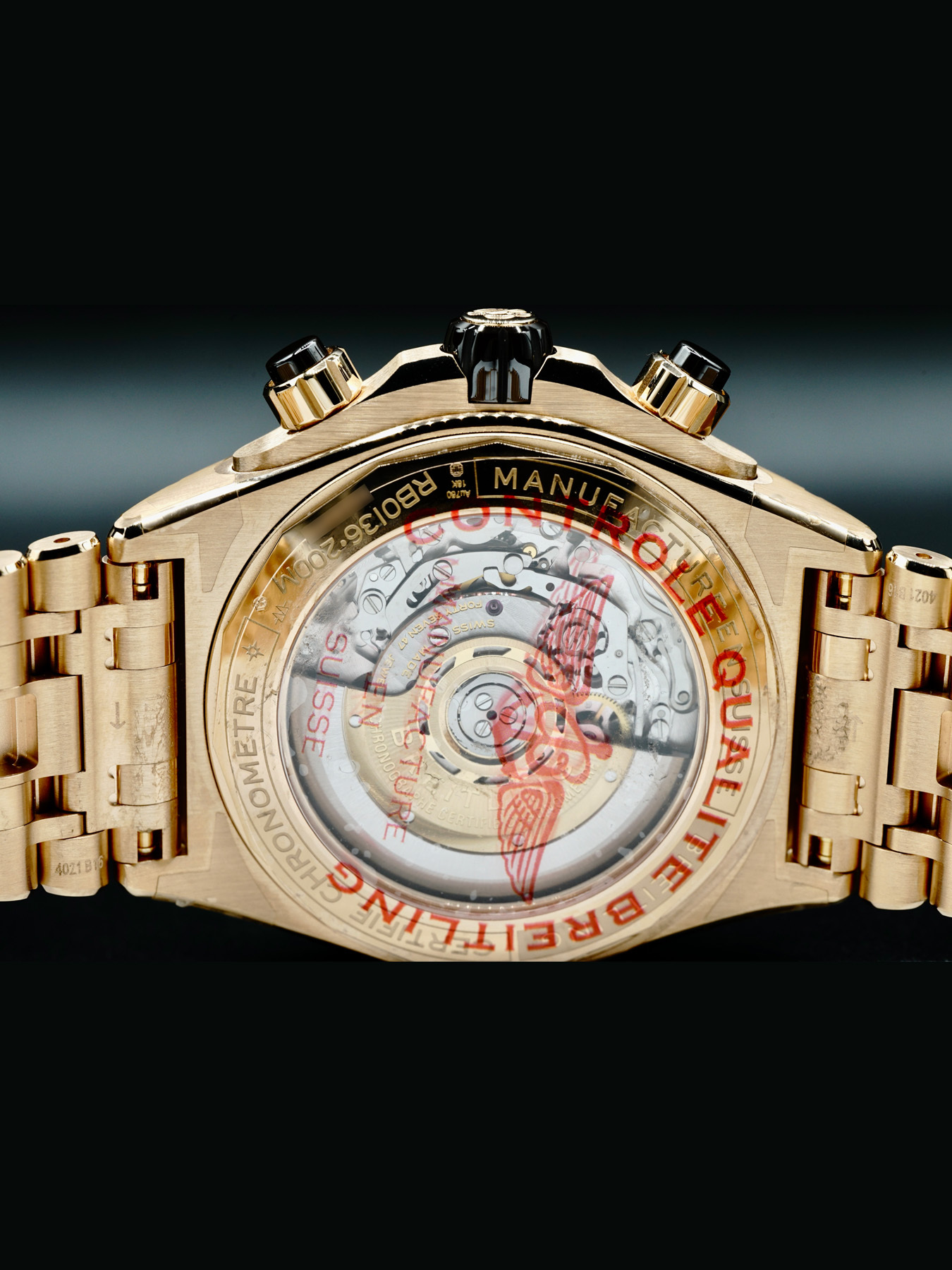 Automatic movement powered by Breitling Caliber 01 with a power reserve of approximately 70 hours. Water resistance up to 200 meters.