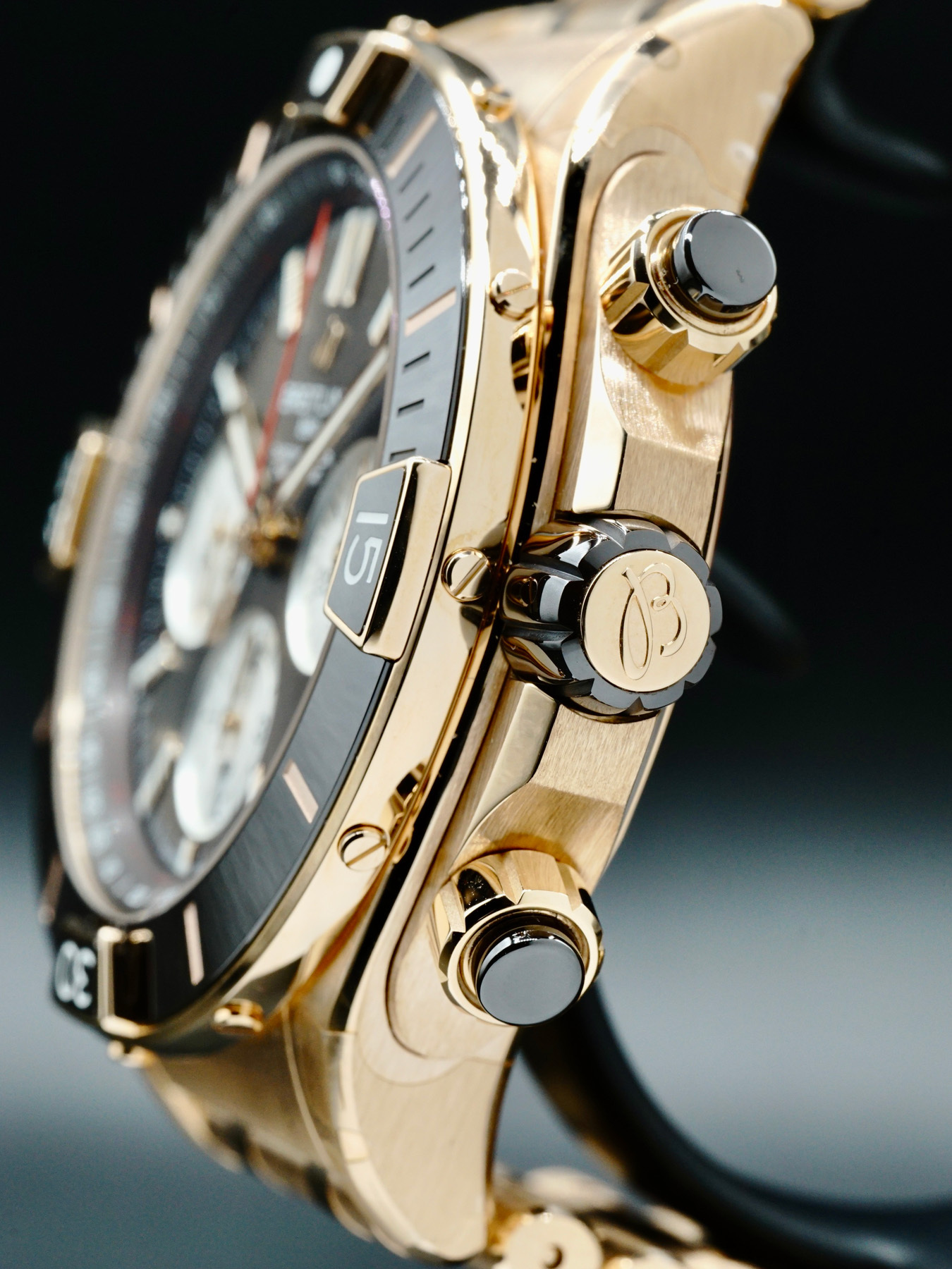 This Breitling Super Chronomat B01 44 features a 44mm 18k rose gold case with a sapphire display case back on an 18k rose gold bracelet. This watch also showcases a brown dial with luminous hands and index dial markers covered by scratch resistant sapphire crystal.