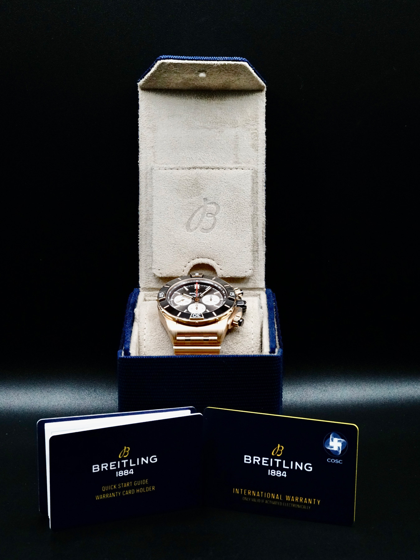 This Breitling Super Chronomat B01 44 RB0136 is in EXCELLENT condition. This watch includes its original box, quick start guide, and international warranty card. No date on warranty card.