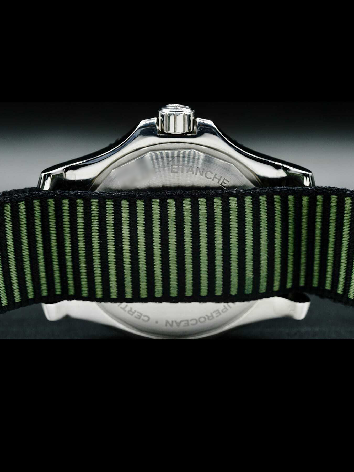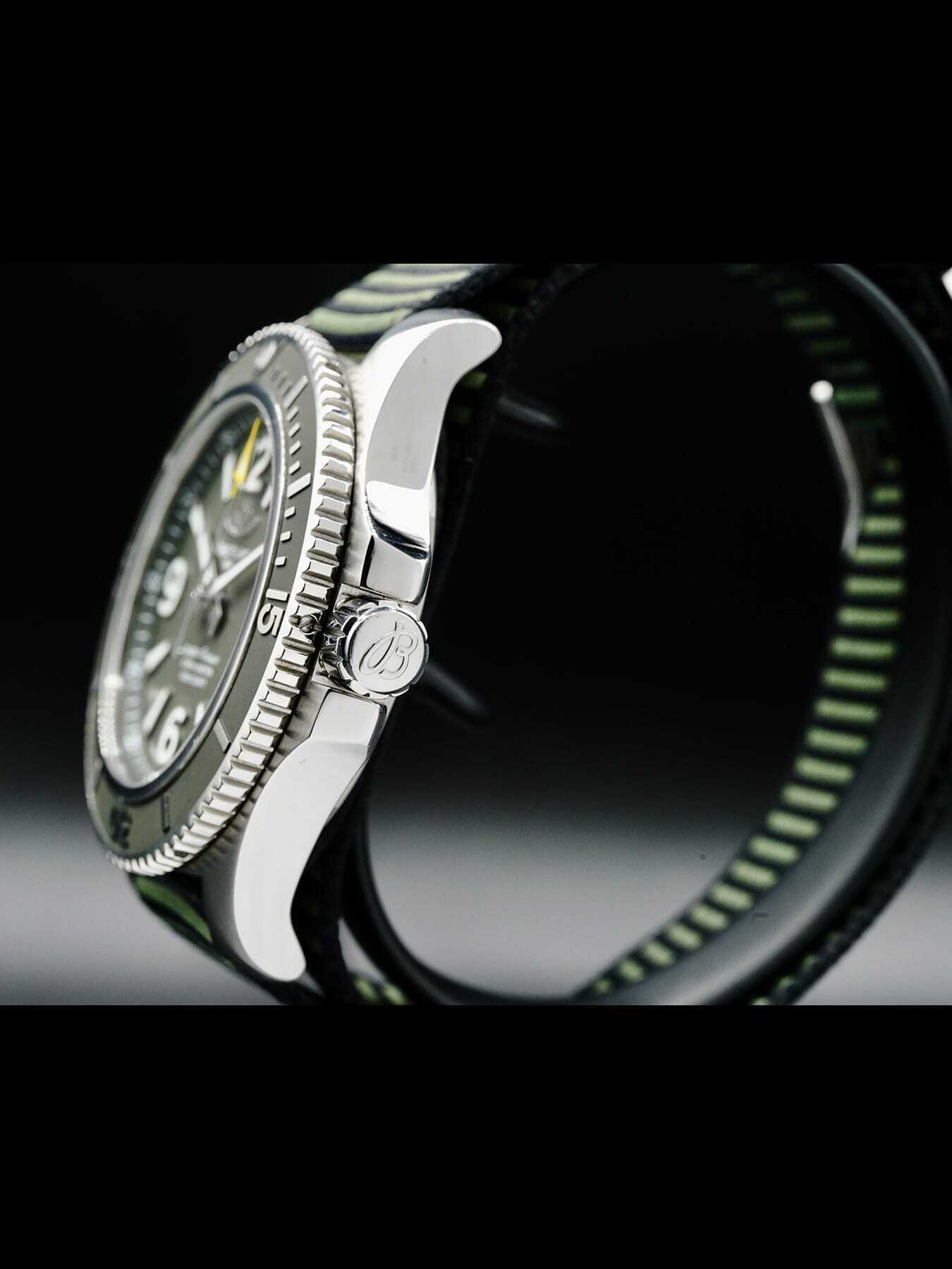 This Breitling Superocean Outerknown features a 44mm stainless steel case on nylon strap. This watch also sports a green dial with luminous hands and indexes.