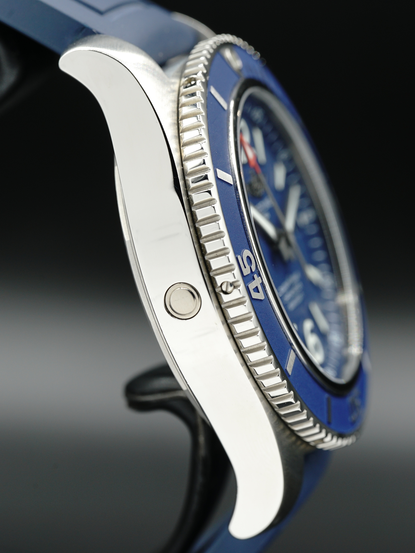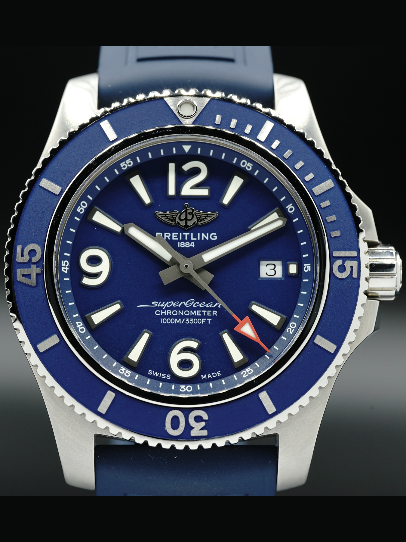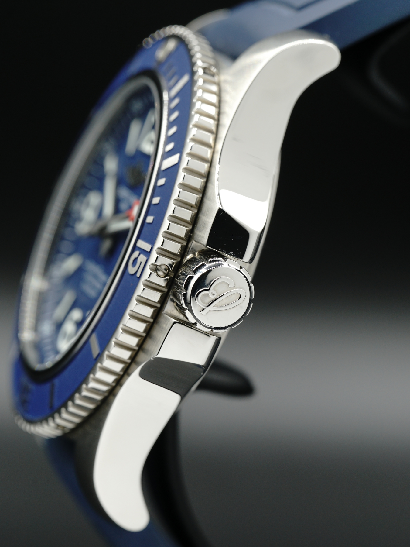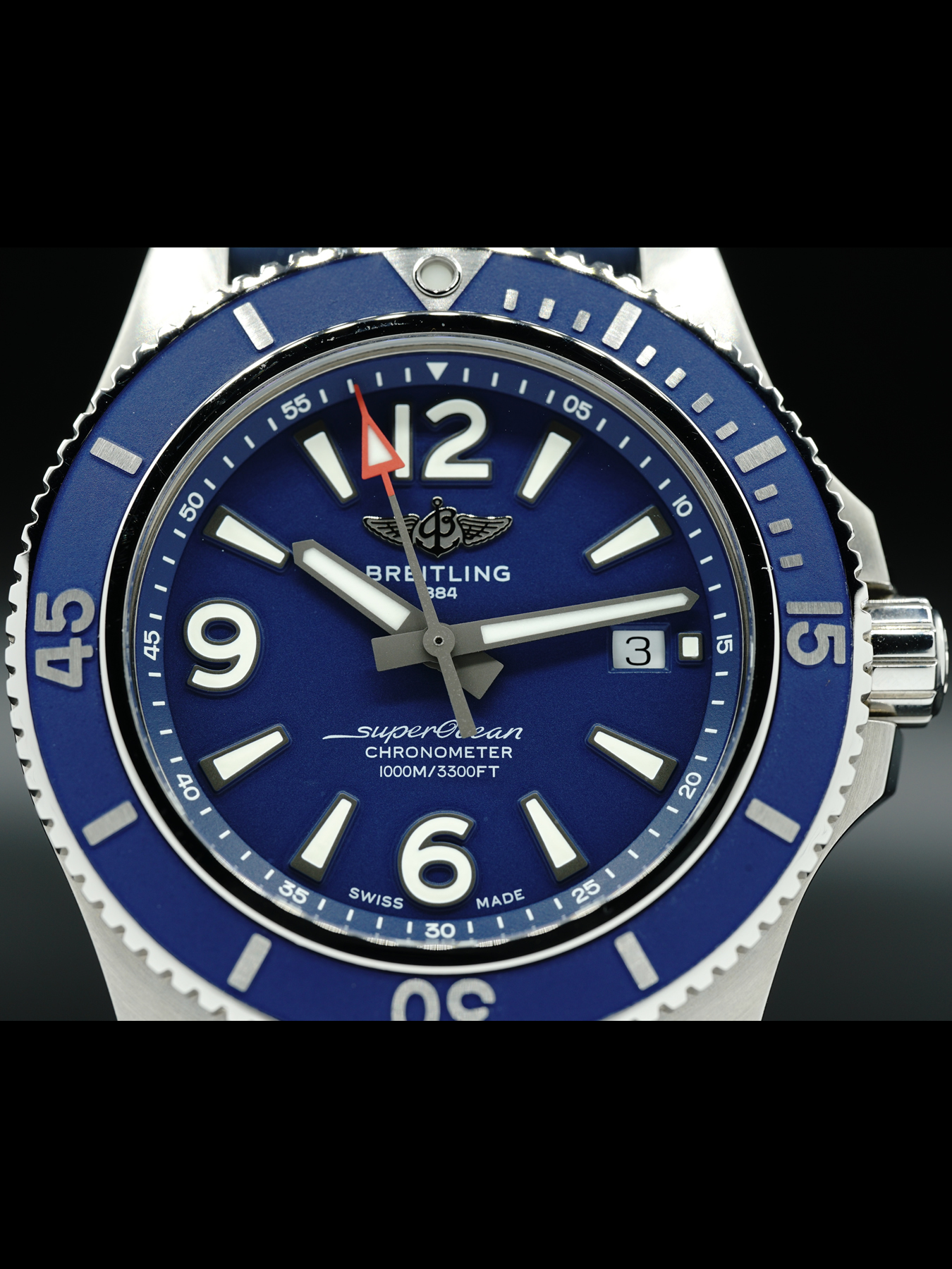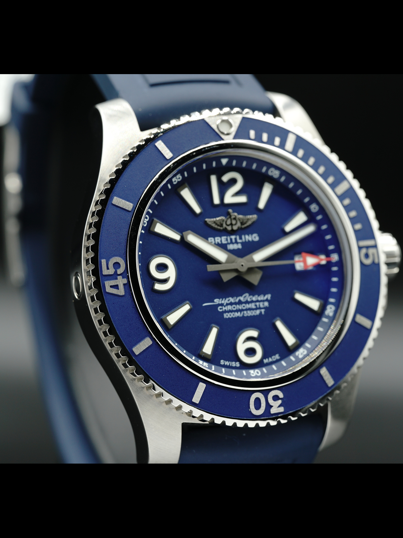 This Breitling Superocean Automatic 44 Stainless Steel Blue is in EXCELLENT condition. This watch features a sturdy 44m stainless steel case, a blue dial, and a rubber strap that matches the blue of the dial. This watch includes its original box, quick start guide, and has its limited warranty by authentic watches dated for August 2021.