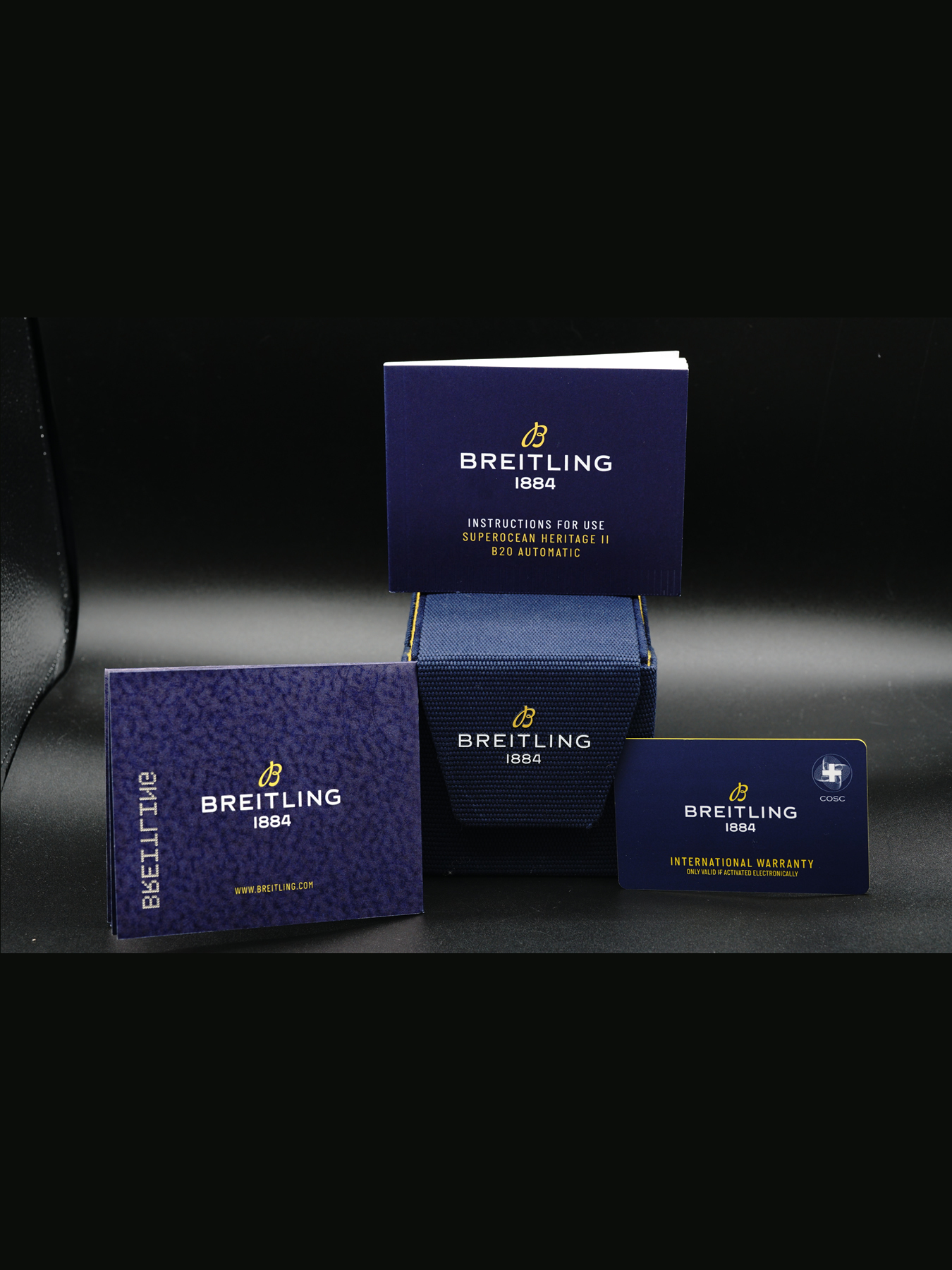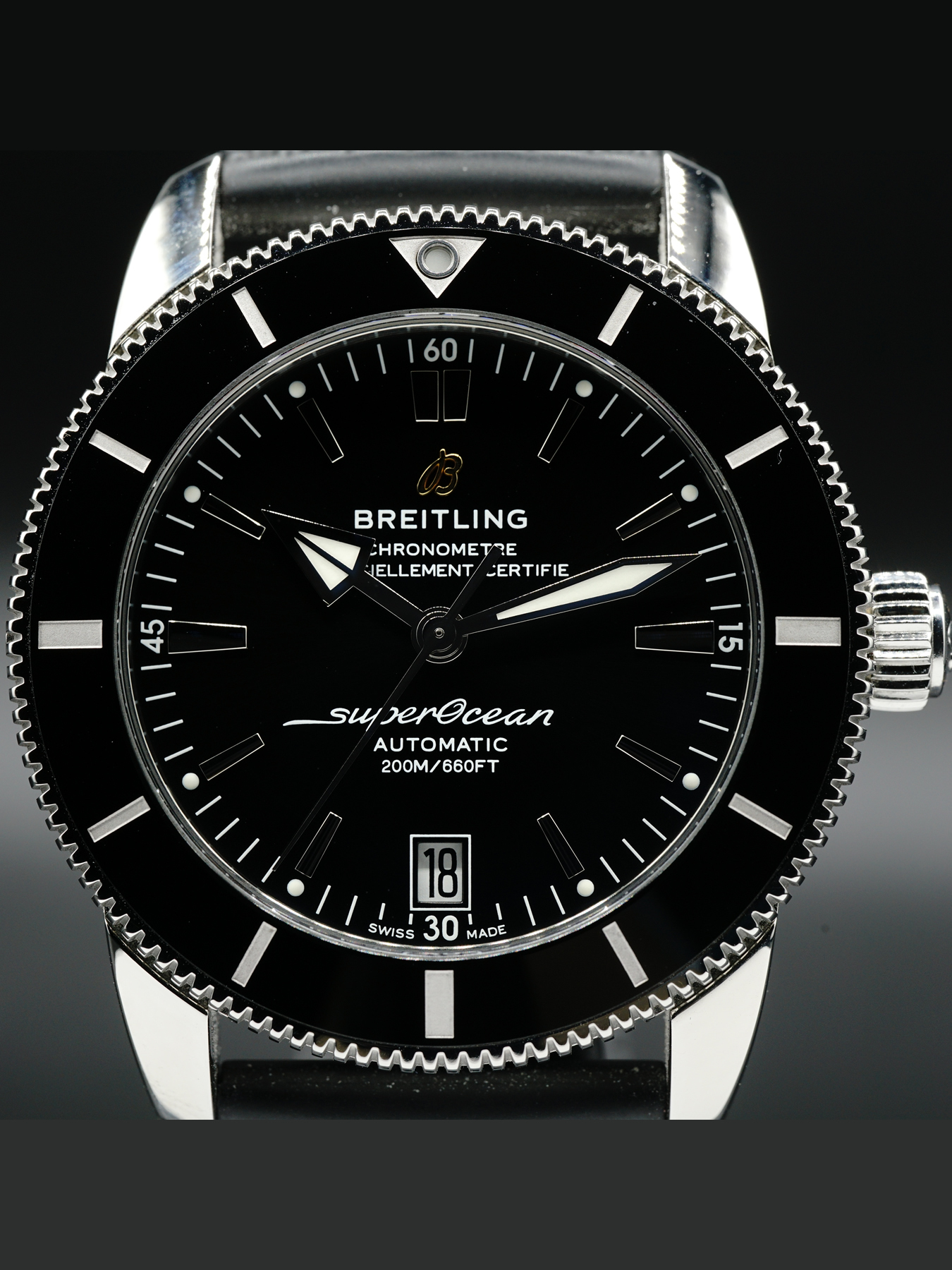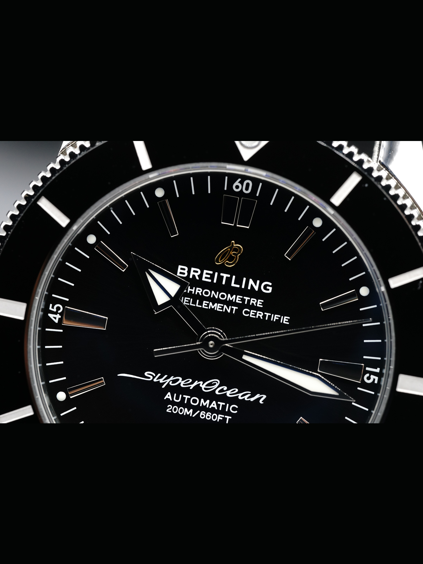 This Breitling Superocean Heritage B20 Automatic 42 Stainless Steel - Black is in EXCELLENT condition. This watch combines iconic design features with a modern touch. Sporty and elegant, the Superocean is a true embodiment of style at sea. This watch features the iconic triangular-shaped hands as well as a unidirectional bezel with a polished ceramic ring. This watch includes its original box, papers, and international warranty card.
