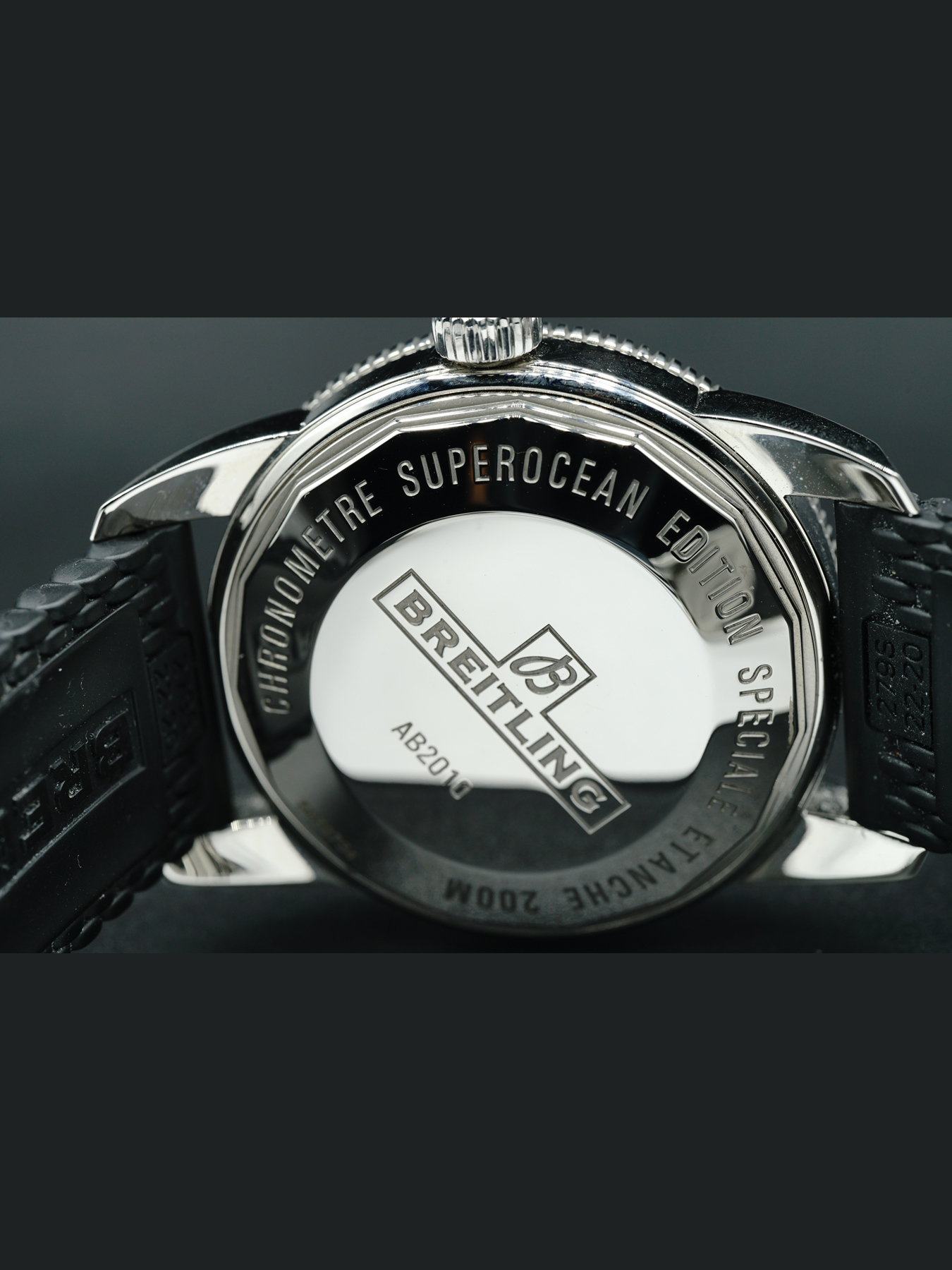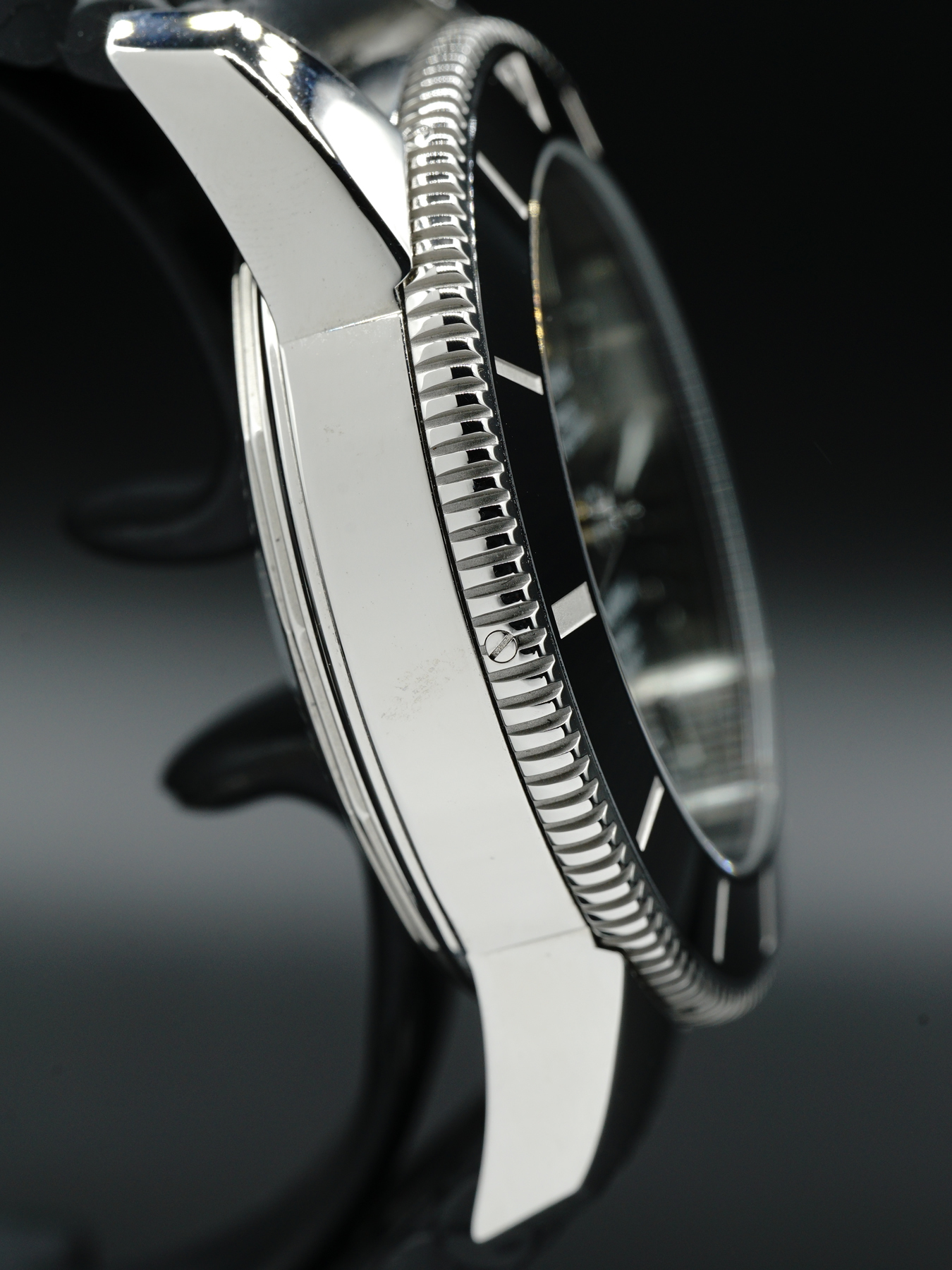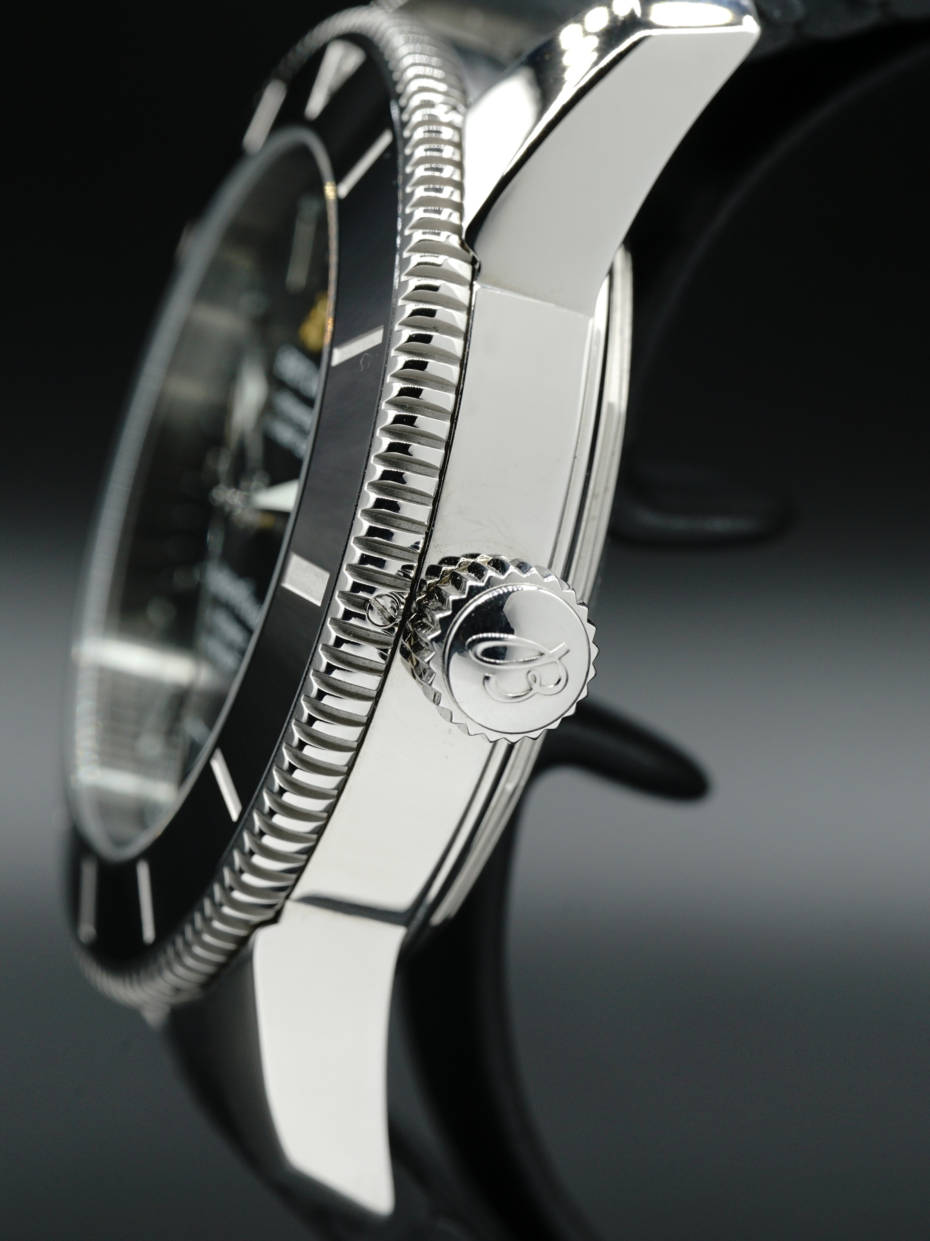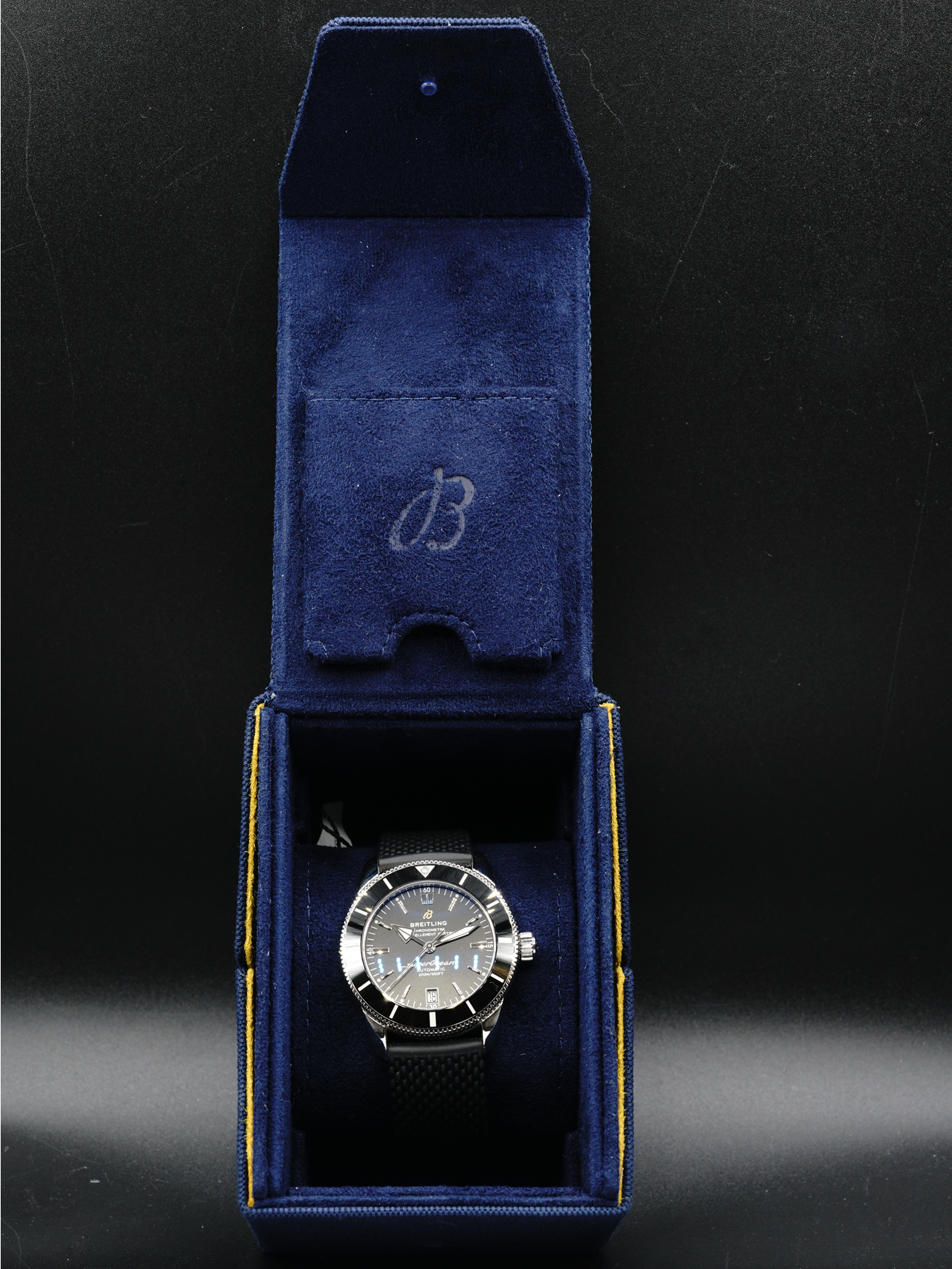 This Breitling Superocean Heritage B20 Automatic 42 Stainless Steel - Black is in EXCELLENT condition. This watch combines iconic design features with a modern touch. Sporty and elegant, the Superocean is a true embodiment of style at sea. This watch features the iconic triangular-shaped hands as well as a unidirectional bezel with a polished ceramic ring. This watch includes its original box, papers, and international warranty card.