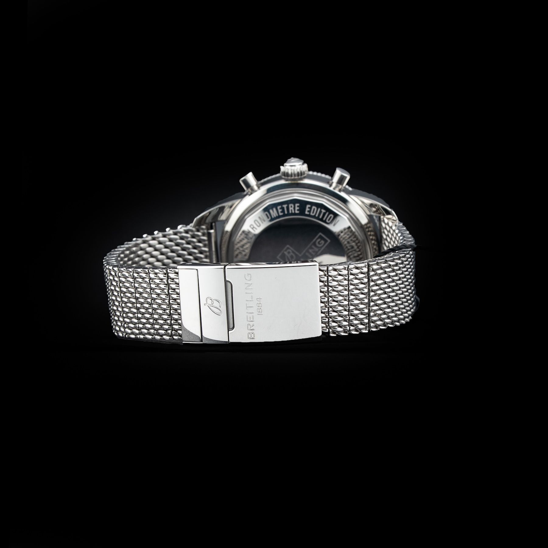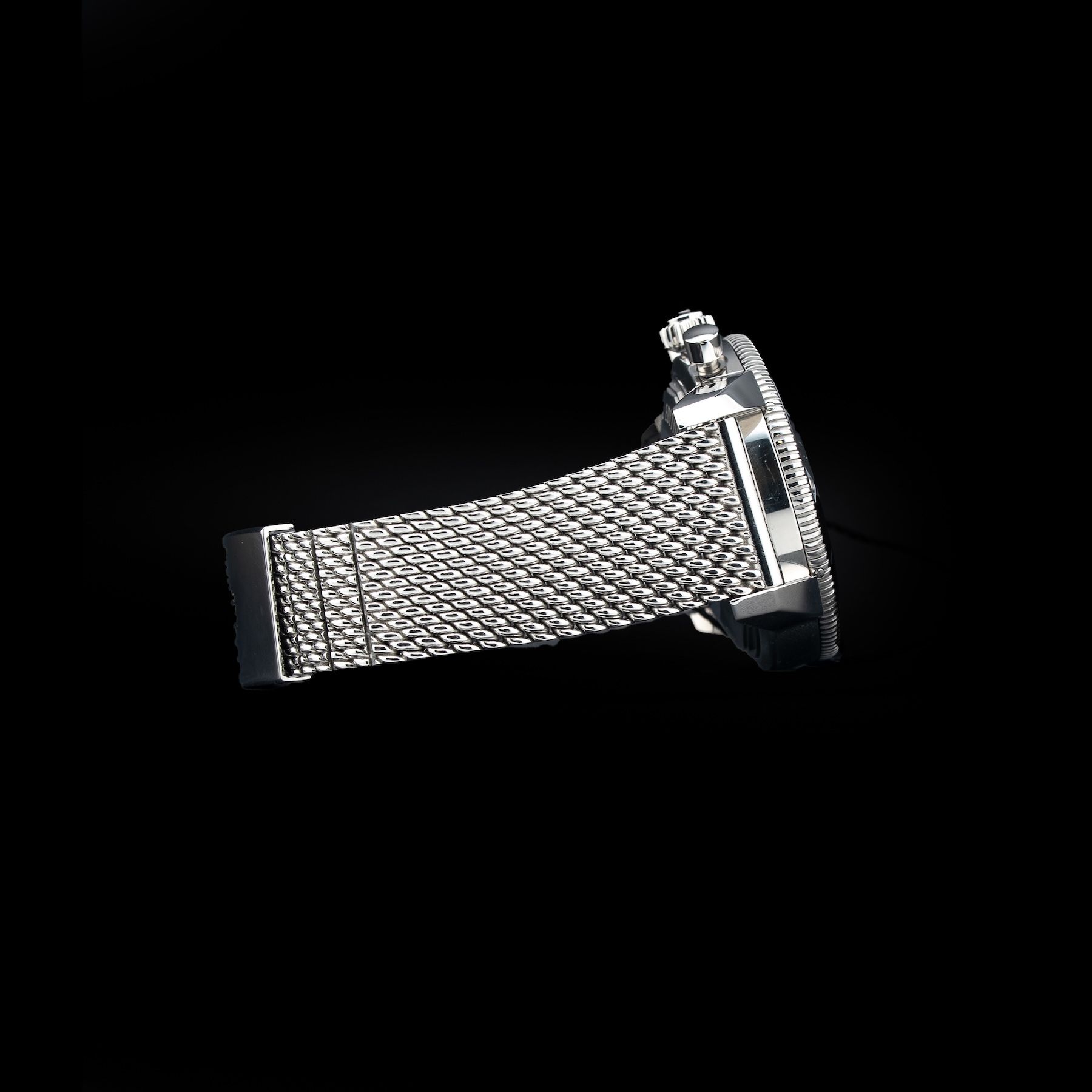 This watch features a 44mm stainless steel case on stainless steel bracelet. This watch also sports a black dial. Powered by a self-winding movement. Water resistance up to 200 meters.