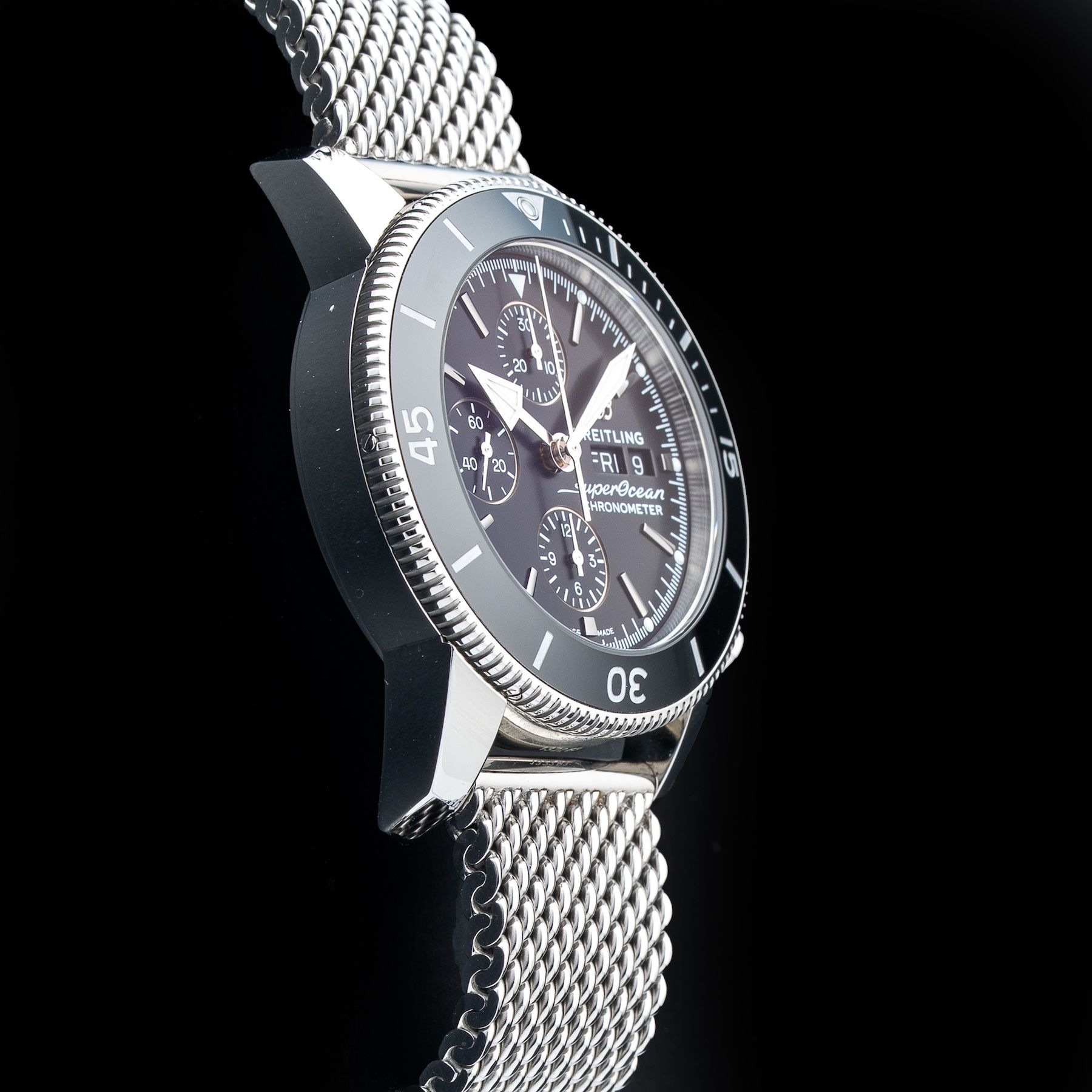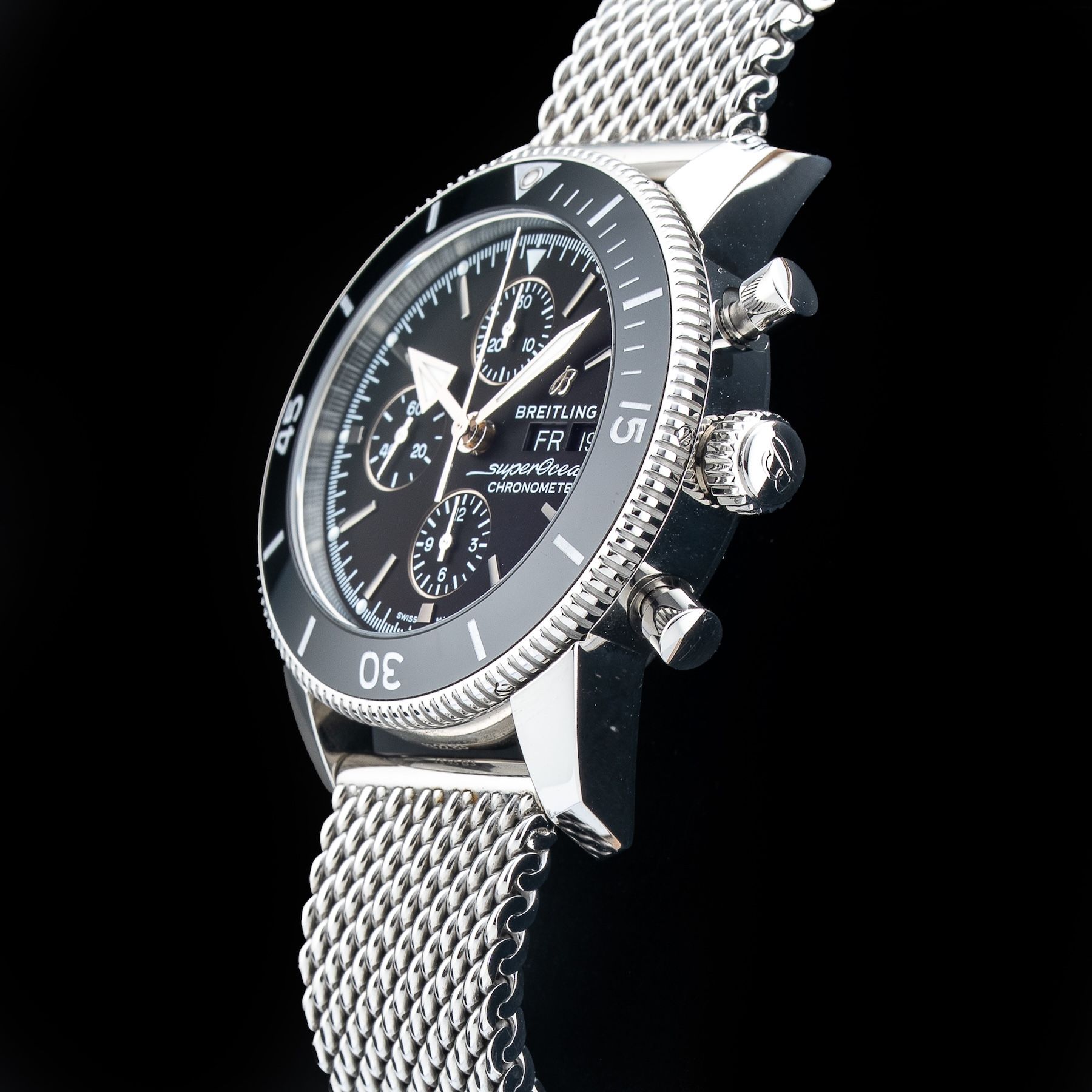 This Breitling Superocean Heritage Chronograph 44 Black Dial Stainless Steel Watch A13313 is in GREAT condition. This watch includes its Original Box, Original Papers and Warranty Card Not Dated. This watch has been fully authenticated and certified by Exquisite Timepieces. Please note, the photos shown are of the actual watch you will receive.