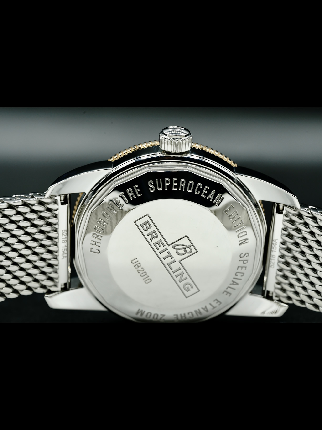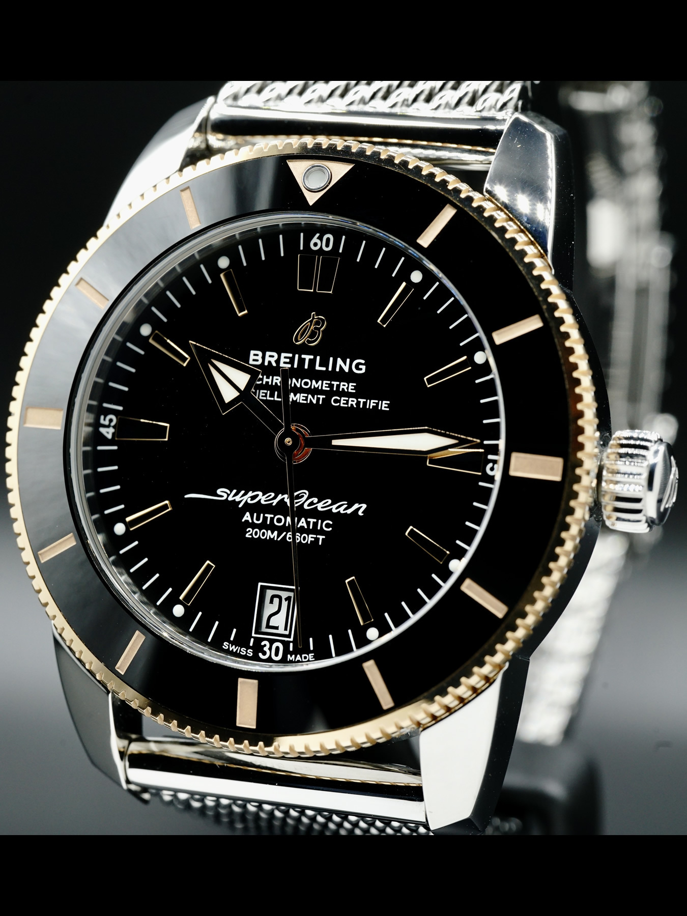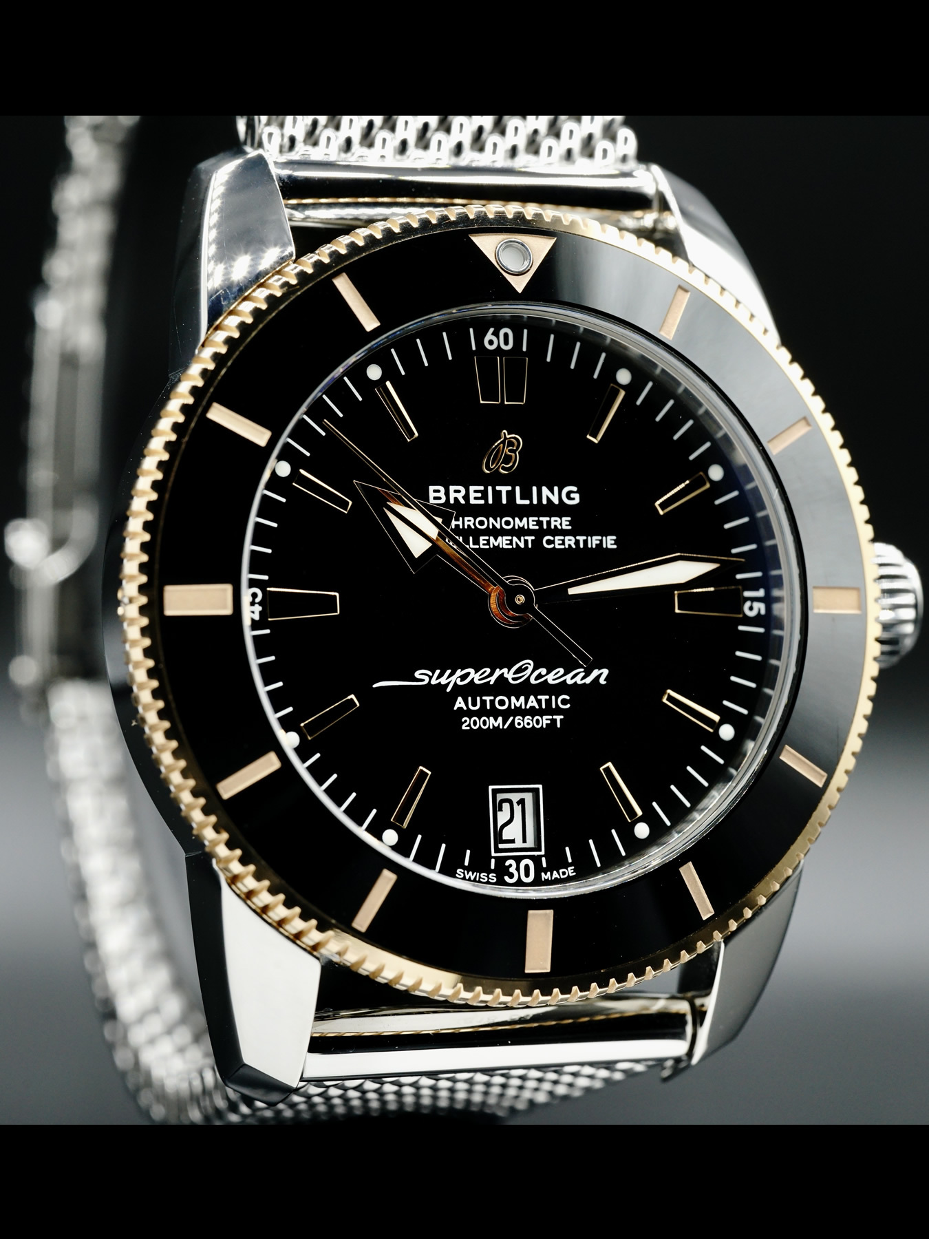 This Breitling Superocean Heritage II features a 42mm stainless steel case with an 18k rose gold with black ceramic bezel on a stainless steel mesh bracelet. This watch also showcases a black dial with luminous rose gold hands and index dial markers covered by scratch resistant sapphire crystal.