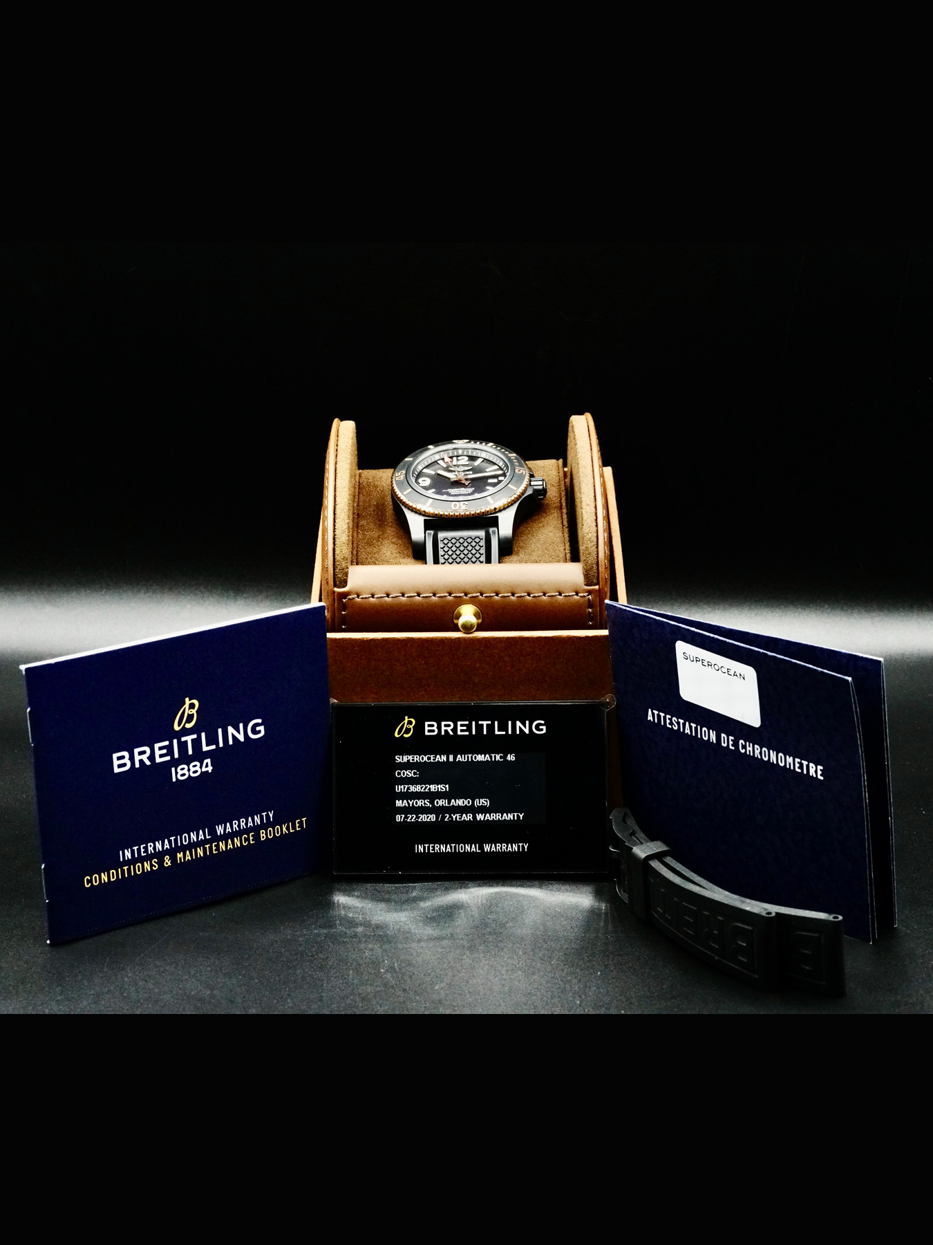 This Breitling SuperOcean II U17368 is in EXCELLENT condition. This watch includes its original box, instruction manual, and international warranty dated for July 2020. Extra black rubber strap.