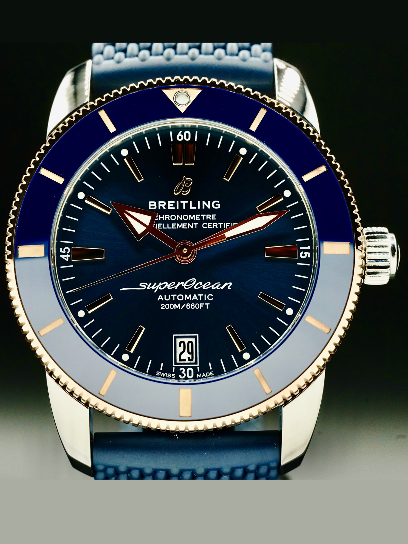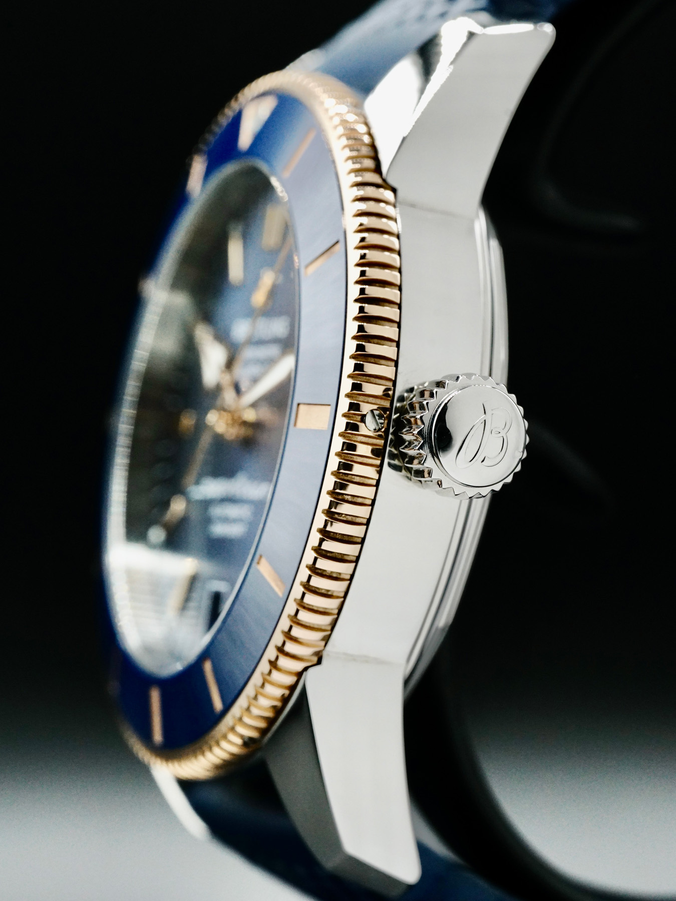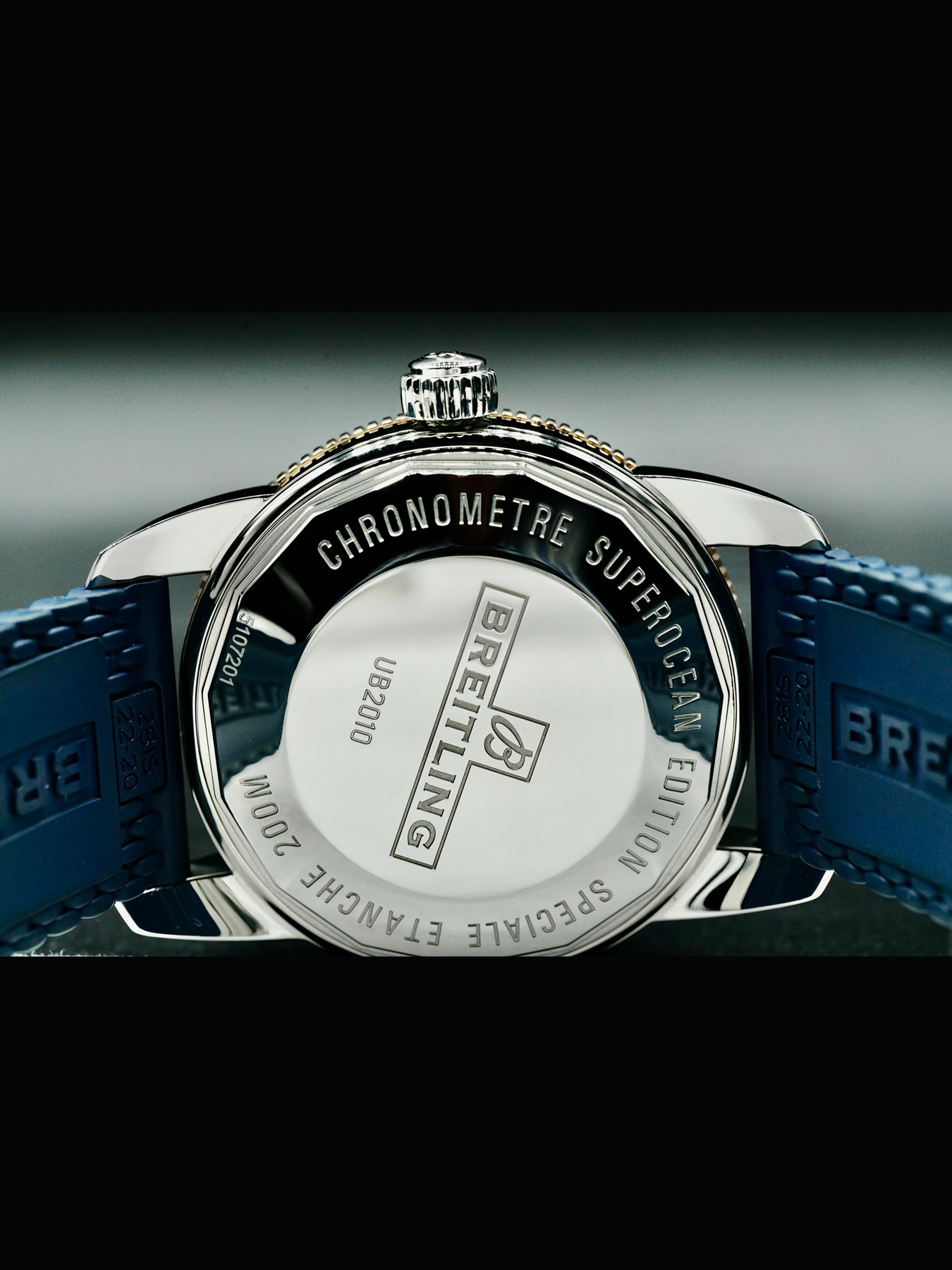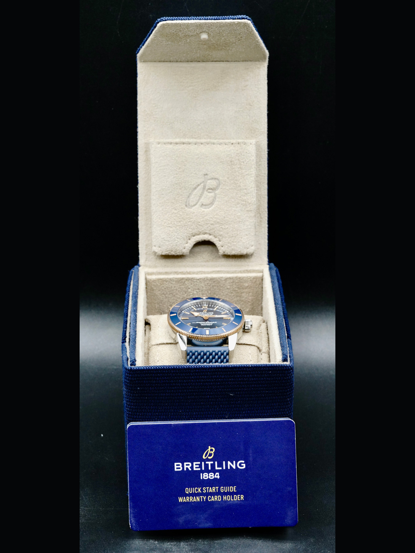 This Breitling UB2010 Superocean Heritage B20 Two-Tone is in GREAT condition. This watch includes original box, papers, instruction booklet and warranty card. This watch has been fully authenticated and certified by Exquisite Timepieces.