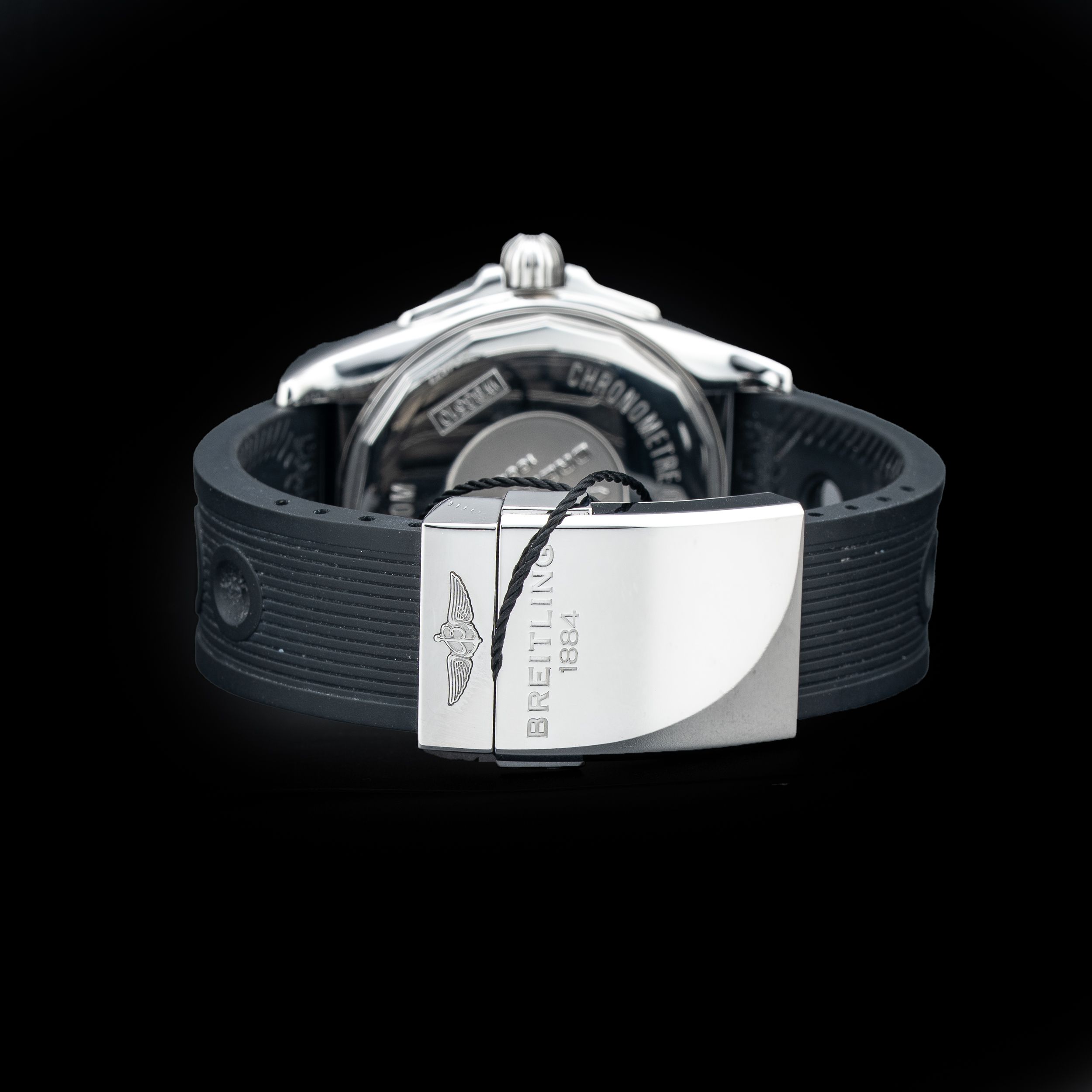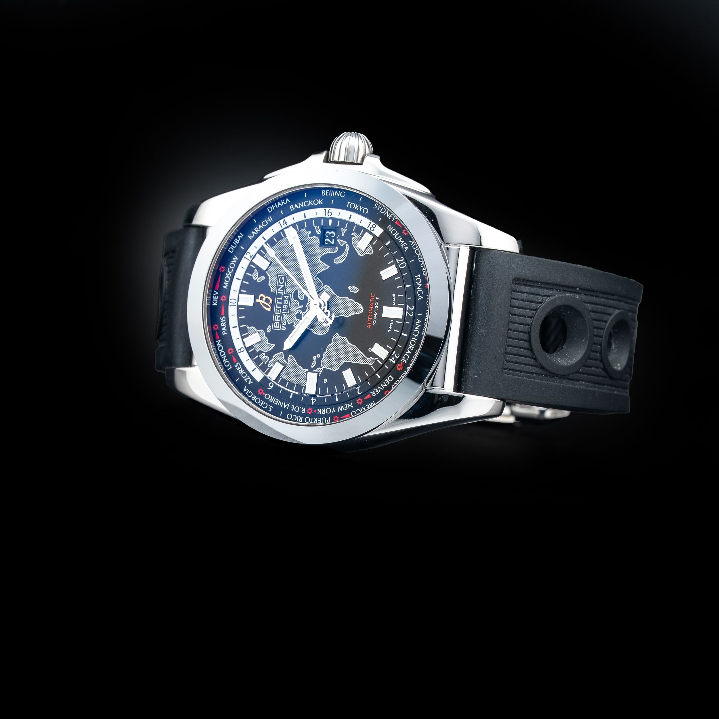 This watch features a 44mm stainless steel case on rubber strap. This watch also sports a black dial. Powered by a self-winding movement. Water resistance up to 100 meters.