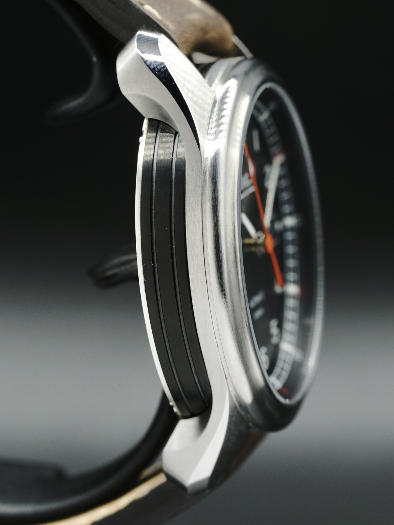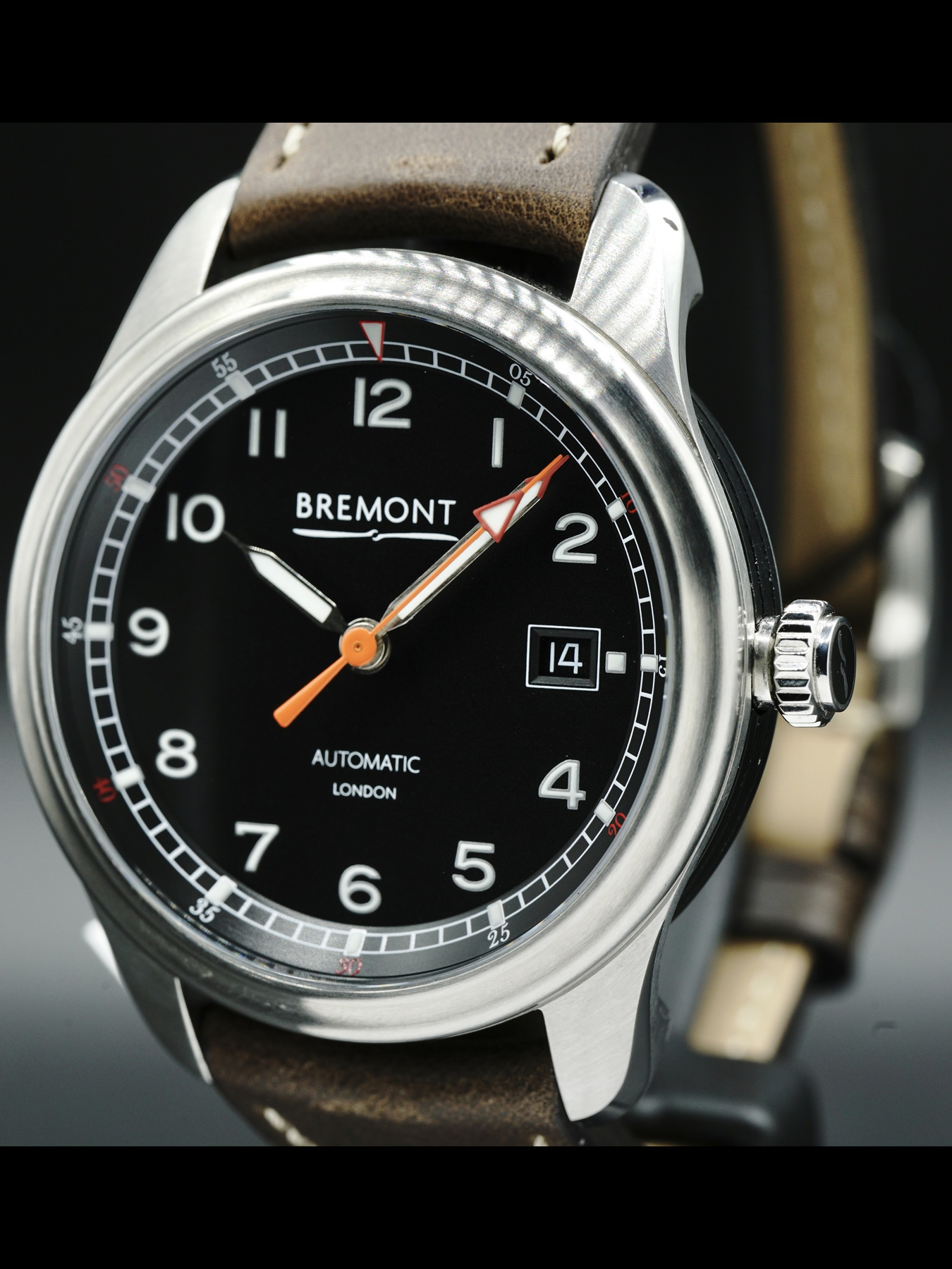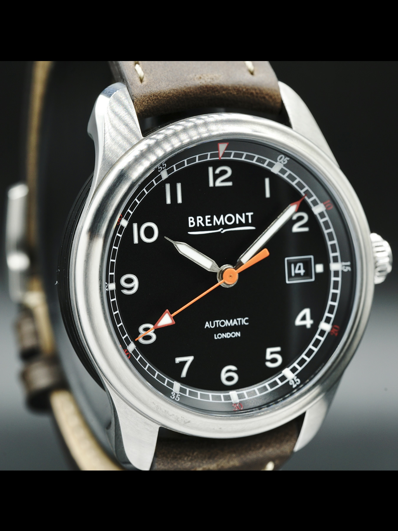 This Bremont Airco Mach 1 features a 40mm hardened stainless steel case with a scratch resistant DLC treated case barrel. This watch has an opalin matt metal dial with integrated dial ring that is covered by sapphire crystal.