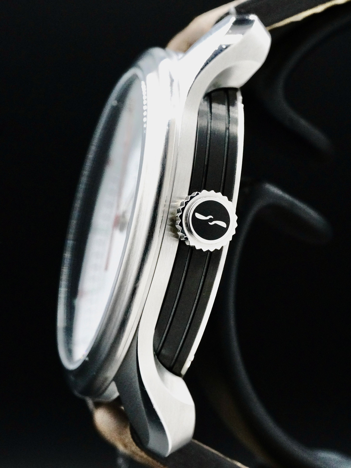 This Bremont AIRCO MACH 1/WH features a 43mm stainless steel case with a display case back on a brown leather strap. This watch also sports a white dial with luminous hands and Arabic numeral dial markers covered by scratch resistant sapphire crystal.