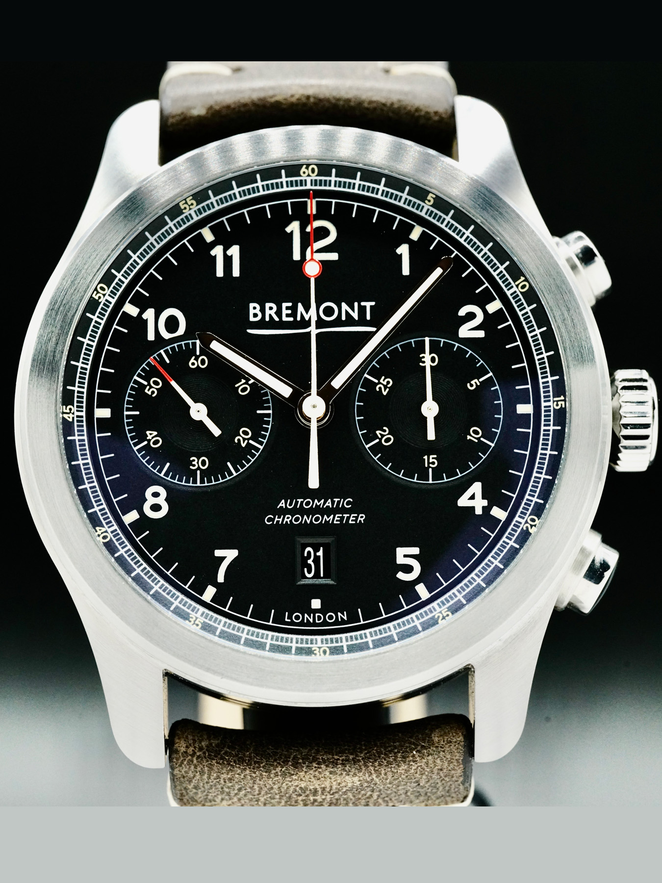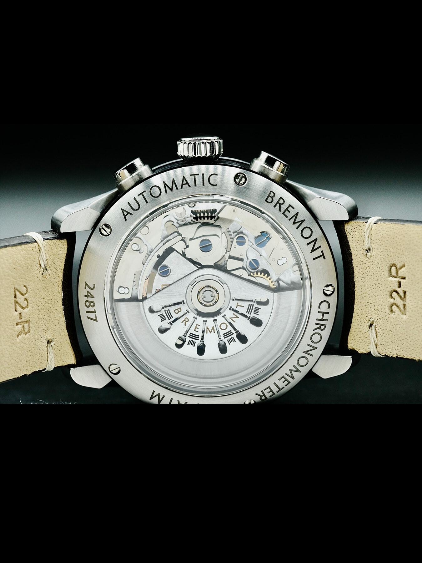 Automatic movement powered by Bremont Caliber BE-50AE with a power reserve of approximately 42 hours. Water resistance up to 100 meters.