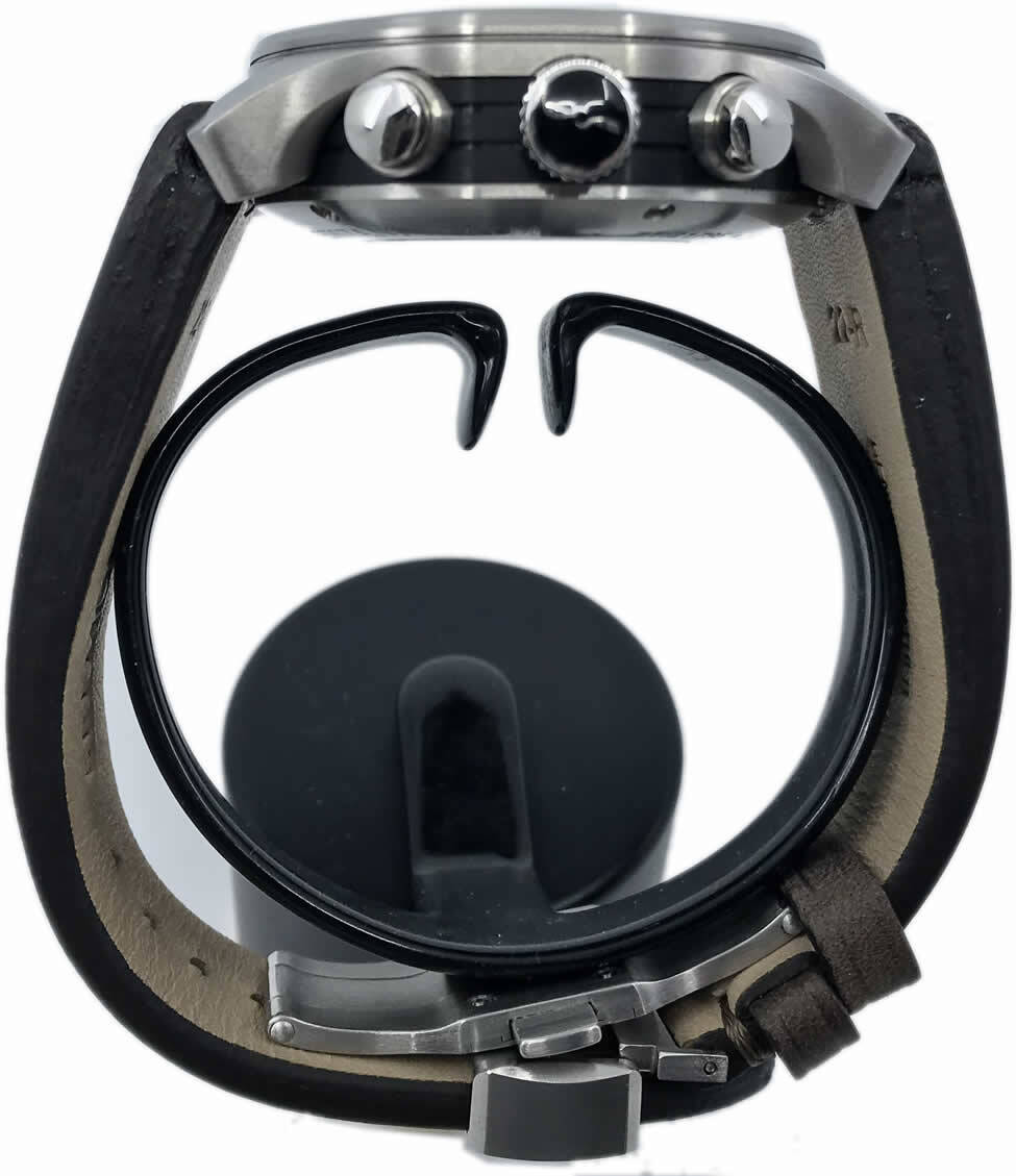 - This timepiece features a 43mm steel case paired with a high quality leather strap. It showcases a distinctive black dial and is powered by a precise automatic winding movement.