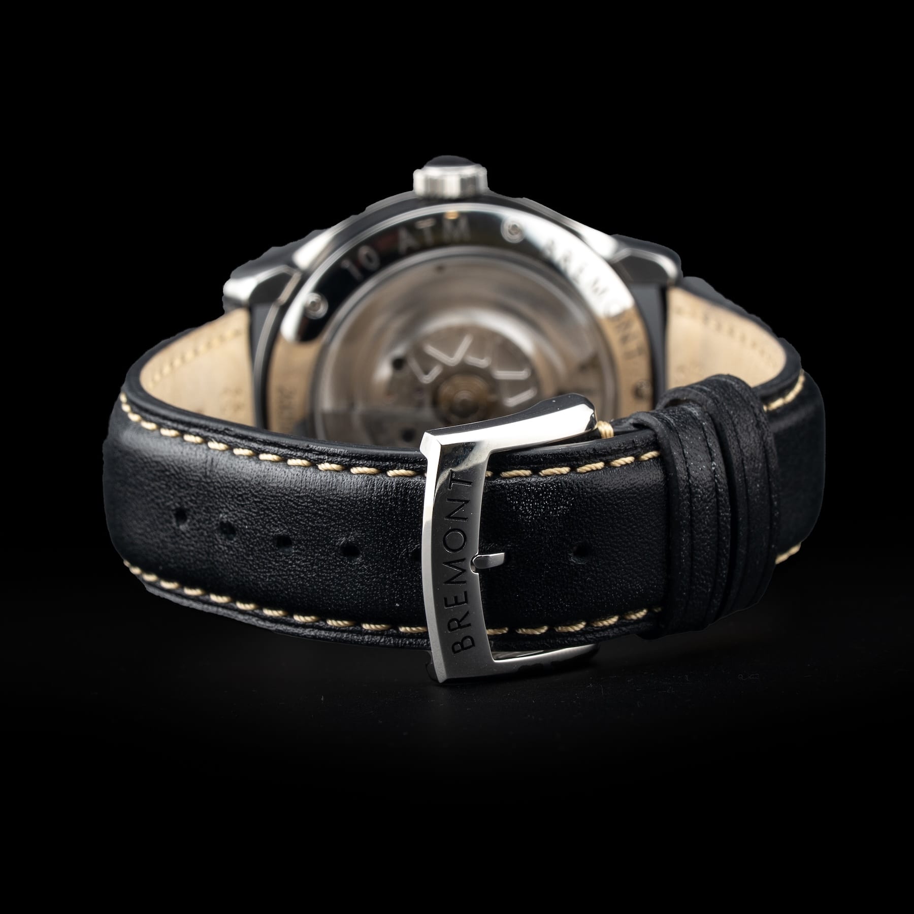 This watch features a 43mm stainless steel case on leather strap. This watch also sports a black dial. Powered by a mechanical automatic movement. Water resistance up to 100 meters.