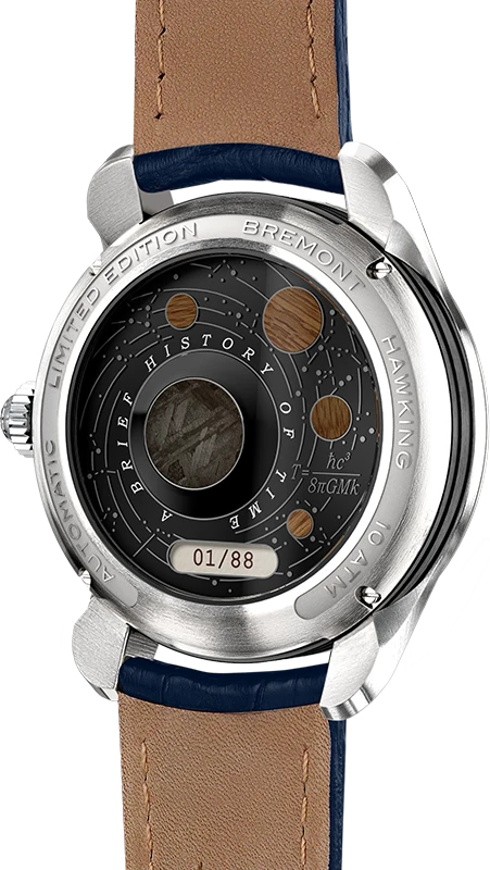 The classically styled Bremont Hawking Limited Edition watch, featuring a retrograde seconds hand and grand date, contains 4 wooden discs inlaid into the back of the watch taken from the desk at which Hawking contemplated the mysteries of the universe, one of his most treasured possessions. This exquisite chronometer also contains some meteorite to symbolise the cosmos which can be seen at the centre of the striking hand-finished closed case back, as well as an etching of stars from the night sky in Oxford, on 8th January 1942, the date that Hawking was born.