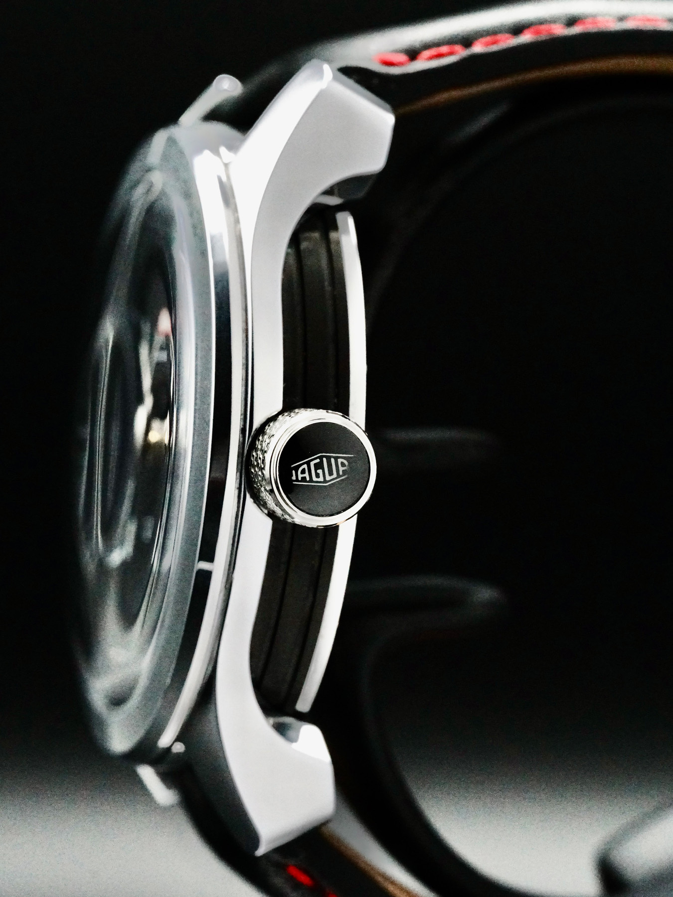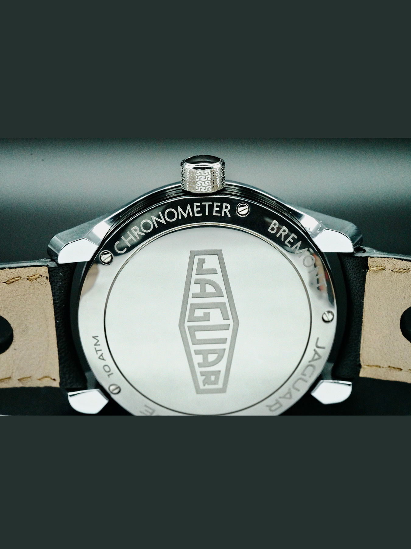 This Bremont Jaguar MKIII features a 43mm stainless steel case with a solid case back on a black leather strap. This watch also sports a black dial with luminous hands and Arabic numeral dial markers covered by scratch resistant sapphire crystal.
