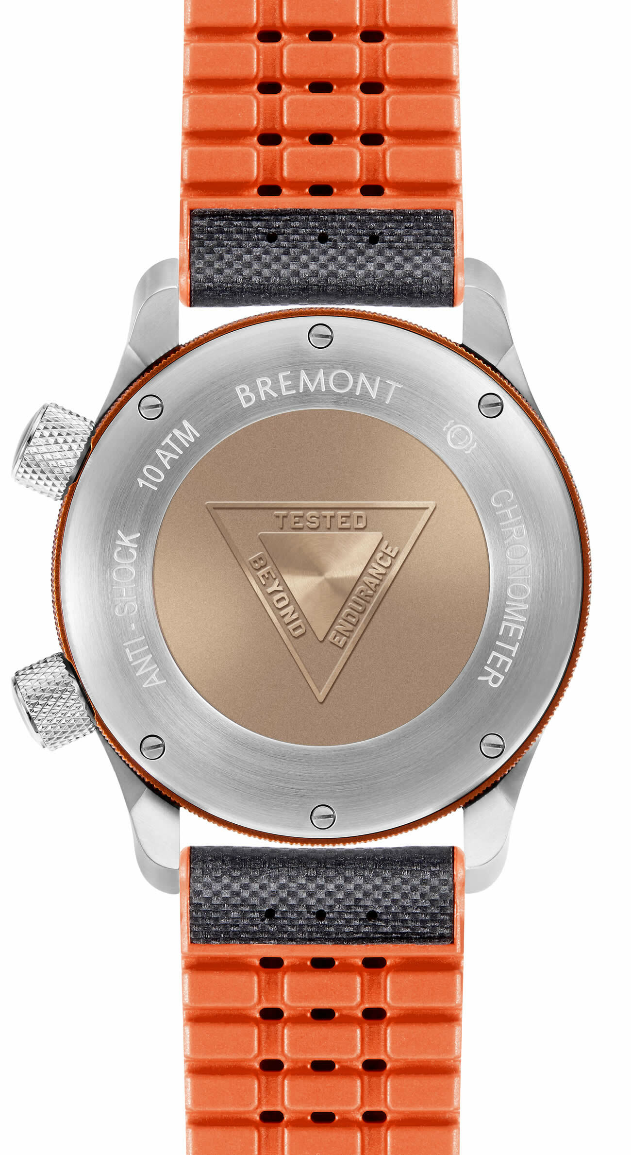 Stainless steel case back, 6 stainless steel screws with polished heads and bronze coloured coin insert with ‘Tested Beyond Endurance’ emblem.