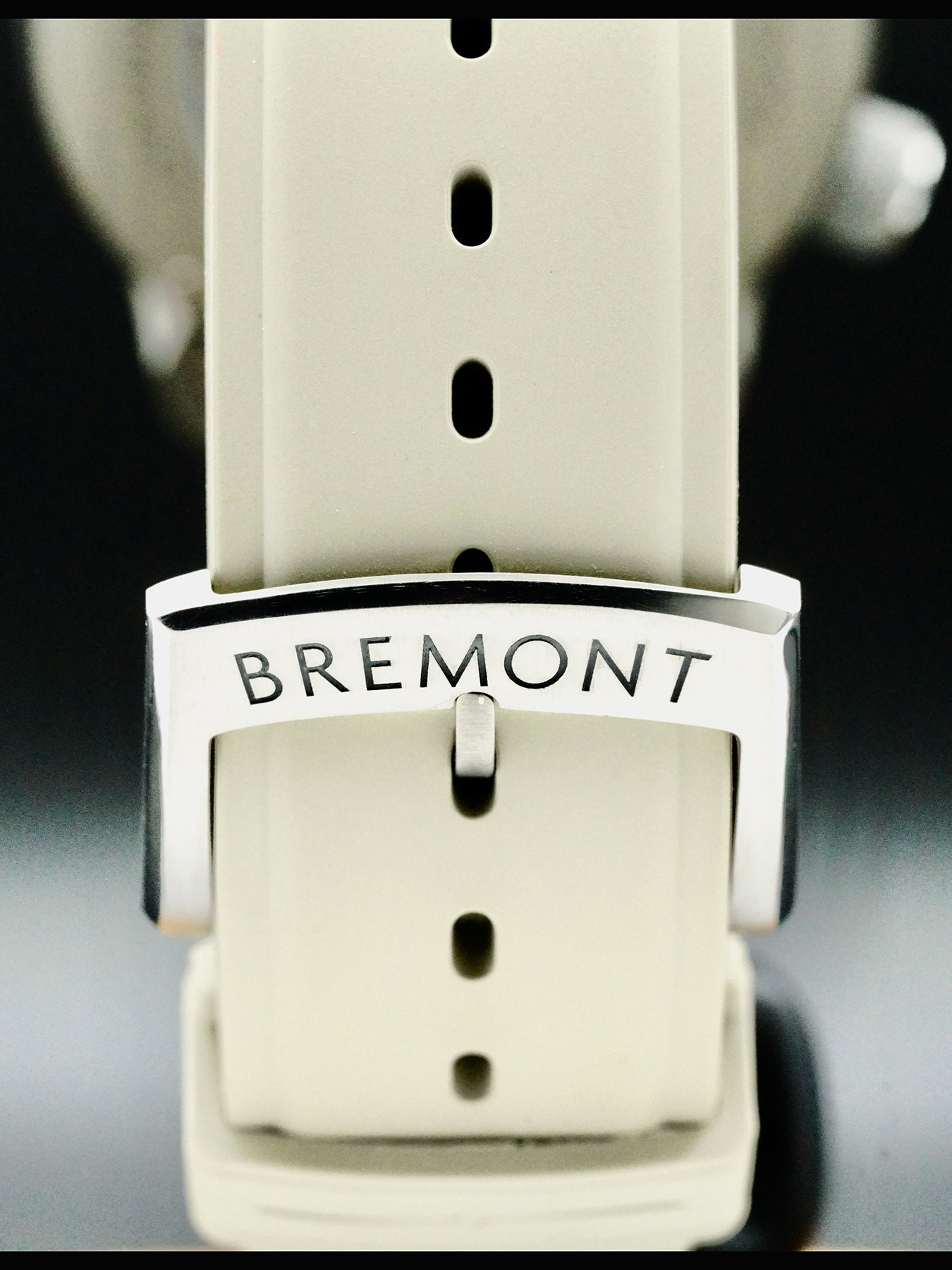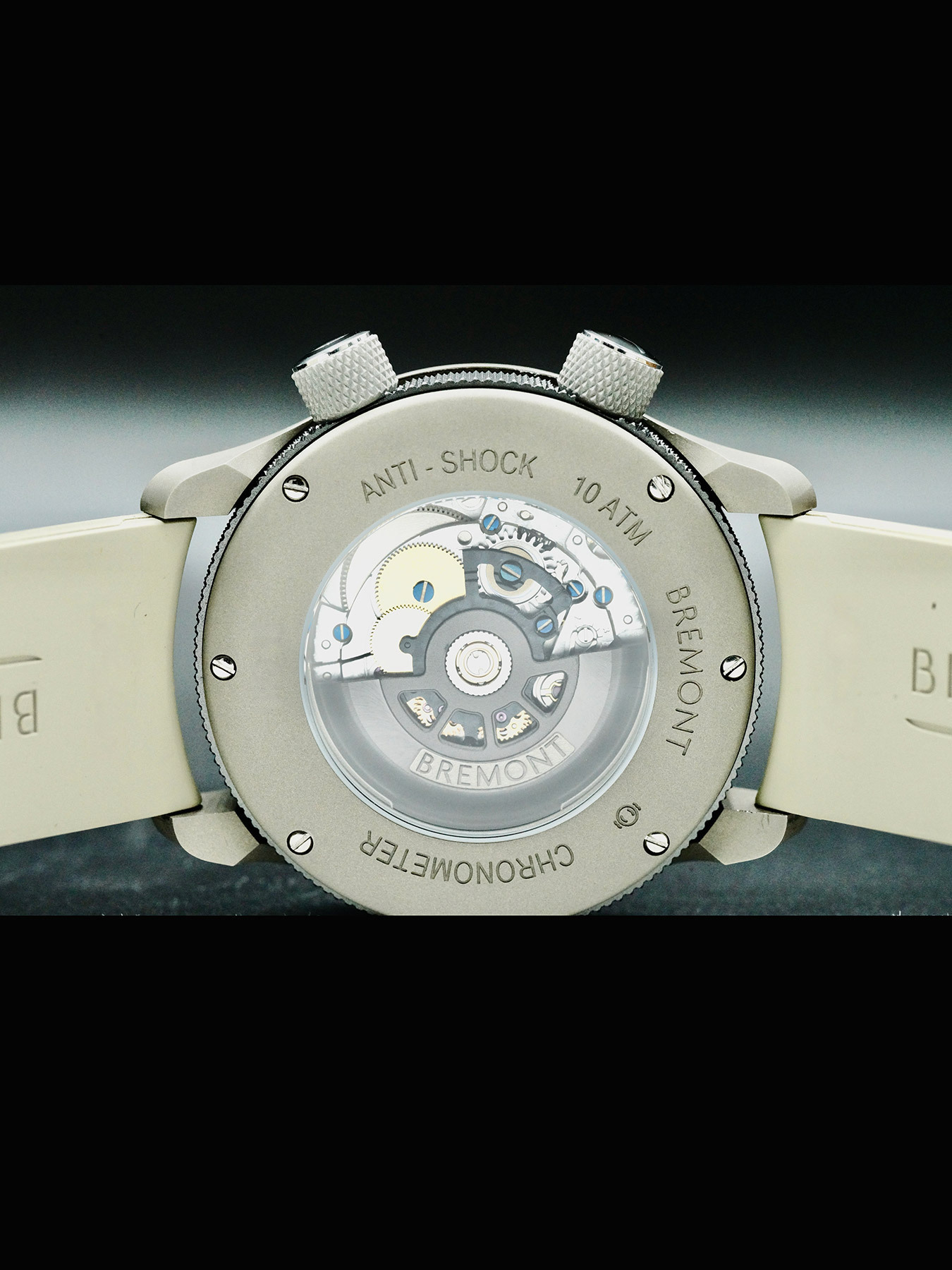 Modified calibre 11 1/2”’ BE-36AE automatic chronometer, 26 jewels, Glucydur balance, Anachron balance spring, 28,800 bph (4Hz) 38-hour power reserve. Increased shock resistance from a modified automatic winding bridge. Bremont skeletonised rotor with stepped windows and branding.