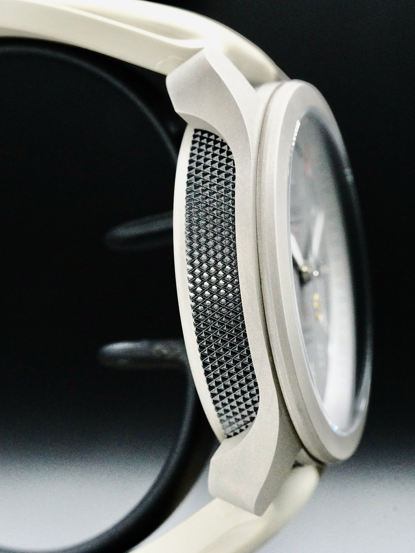 Grade 5 Titanium case, matt finished in a protective, tactical coating. Trip-Tick® case construction with an anthracite coloured, knurled aluminium barrel. Protective patented anti-shock movement mount. Inner soft iron anti-magnetic Faraday ring to protect movement. Patented inner bi-directional Roto-Click® bezel, operated by crown at 4H. Case diameter 43mm, lug width 22mm, lug to lug 50mm, weight 64g.