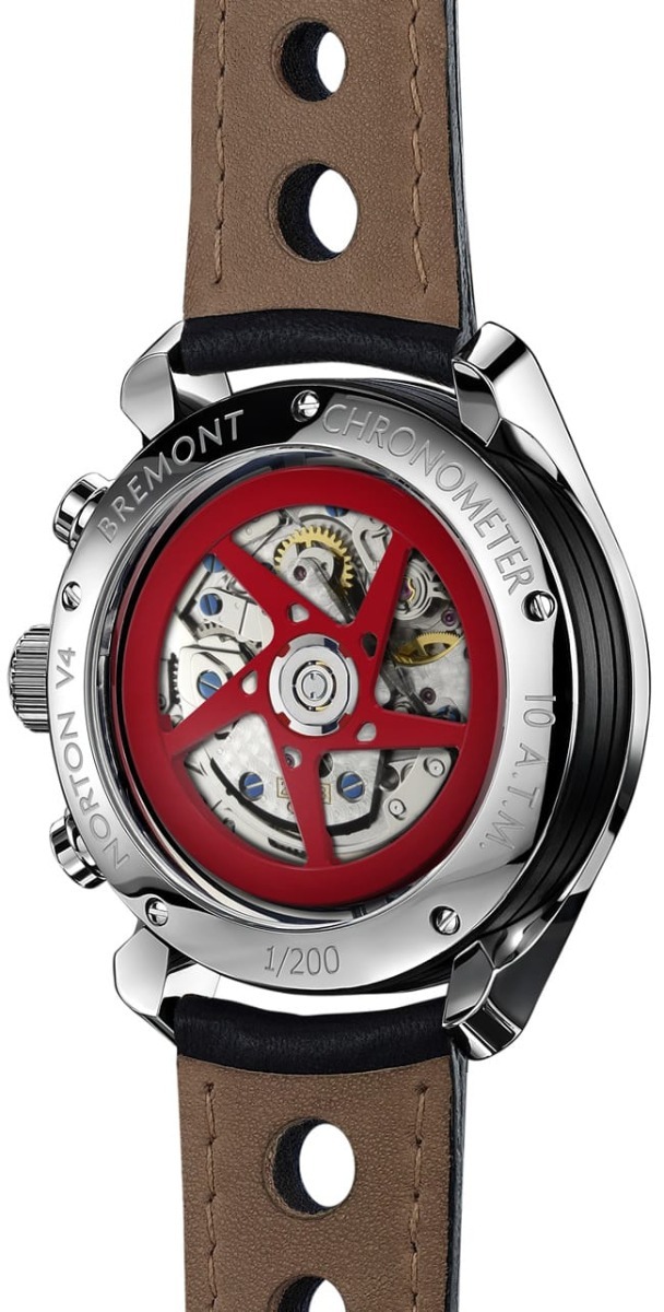Modified calibre 13 1?4 BE-50AE automatic chronometer fitted with Norton VR Rim inspired decorated rotor and 28 jewels, Glucydur balance, Anachron balance spring, Nivaflex 1 mainspring, Rated frequency of 28,800 A/h with 42-hour minimum power reserve.