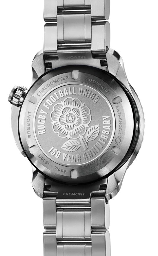 The anniversary timepiece encompasses all the qualities on which the partnership was founded, namely the shared values of durability, precision, and technical ability. The Bremont RFU 150 features a chronograph movement with 24h GMT hand as well as the Bremont patented protective anti-shock movement mount. The 43mm satin and polished stainless steel case is fitted with a uni-directional rotating blue ceramic bezel and features an automatic helium escape valve and crown protector. The bezel also allows keen timekeepers to keep an eye on the match playing time with indicators showing the approach of half/full time in red and any extra-time added on in white. The dial is inspired by the blue tone of the England rugby team alternative kit and the inner dial ring is proudly stamped ‘Twickenham’. The closed case back features the RFU’s new, specially designed, Heritage Rose emblem celebrating the anniversary, taking inspiration from the first rose that featured on the players’ caps from 1871 (and still does today).