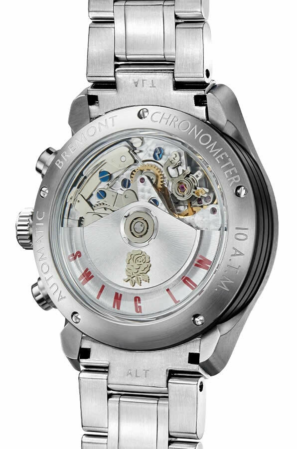 Calibre 13 1/4’’’ BE-50AE automatic, 25 jewels, Glucydur balance, Anachron balance spring, Nivaflex 1 mainspring, 28,800bph, 42 hour power reserve. Bremont decorated rotor with England Rugby rose and ‘SWING LOW’