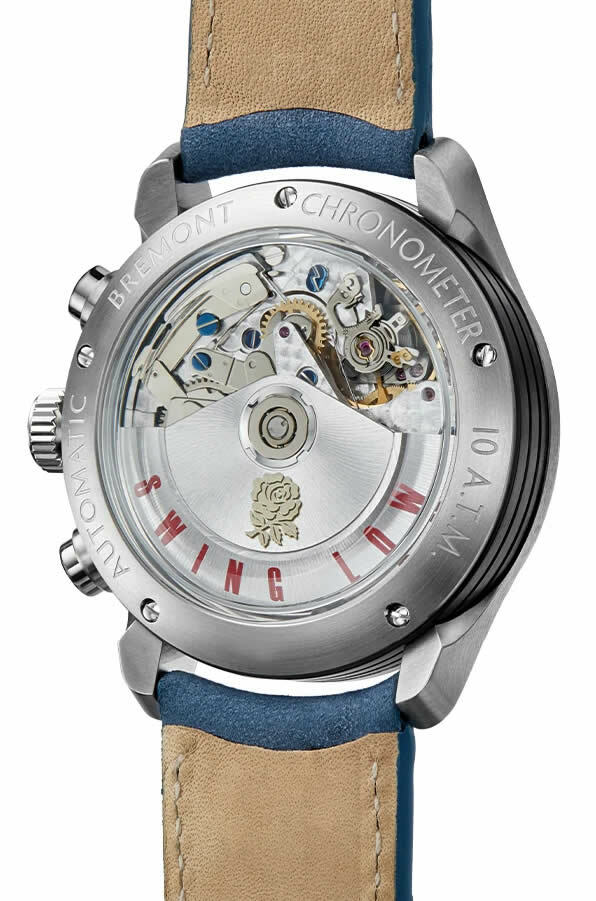 Calibre 13 1/4’’’ BE-50AE automatic, 25 jewels, Glucydur balance, Anachron balance spring, Nivaflex 1 mainspring, 28,800bph, 42 hour power reserve. Bremont decorated rotor with England Rugby rose and ‘SWING LOW’