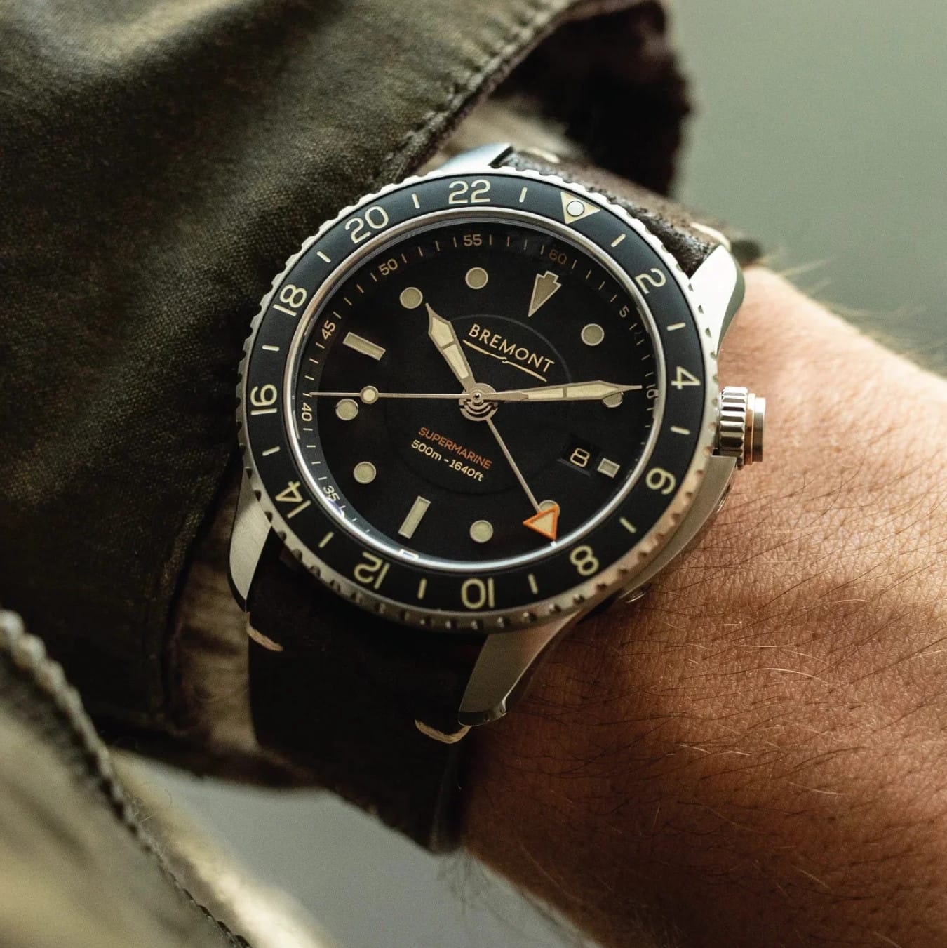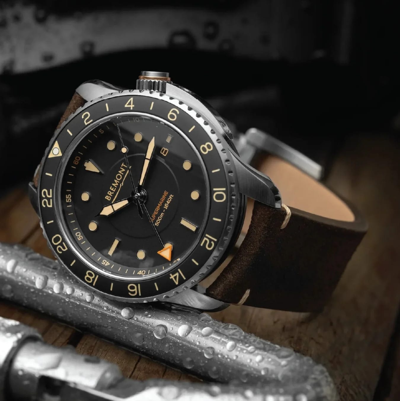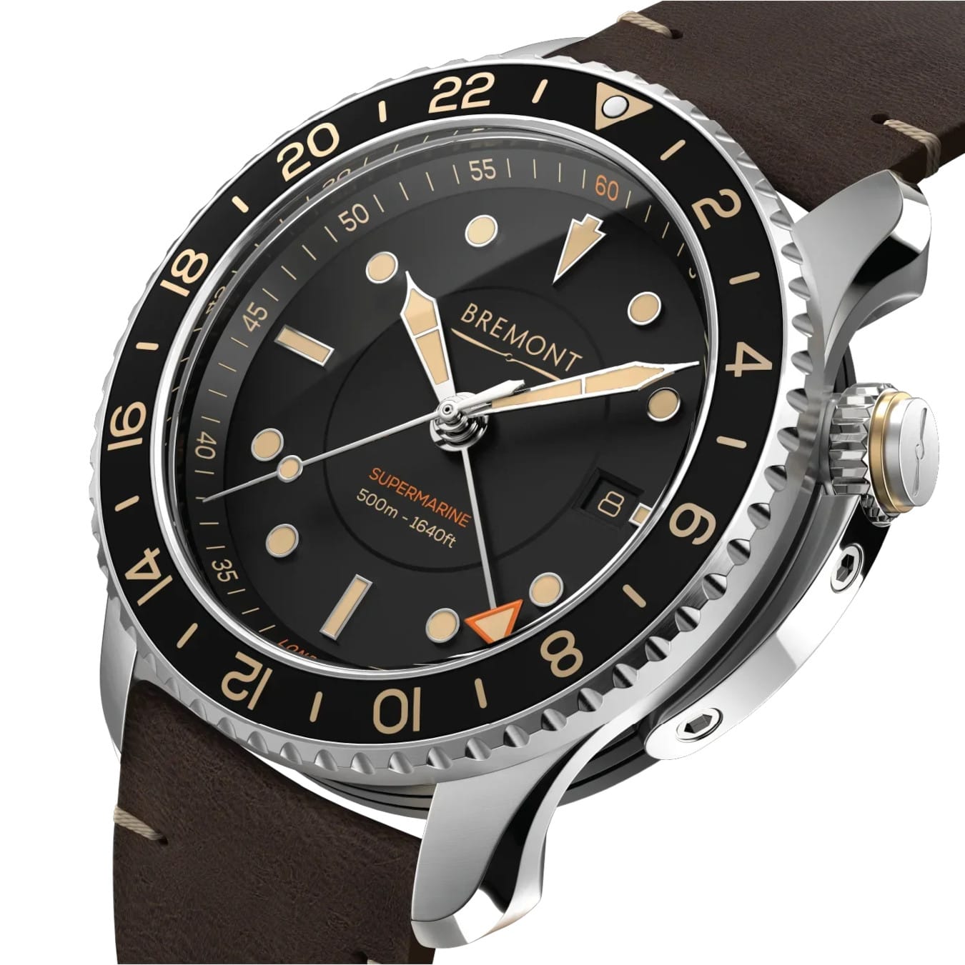 Technical features for the S502 not only include its GMT functionality but also its deep-diving features with 500m water resistance and an automatic helium escape valve with a screw-down crown. The technical design aesthetic of the watch is complemented by Bremont’s vintage Super-LumiNova® which can be seen on the black ceramic unidirectional bezel featuring 24 hour markers.