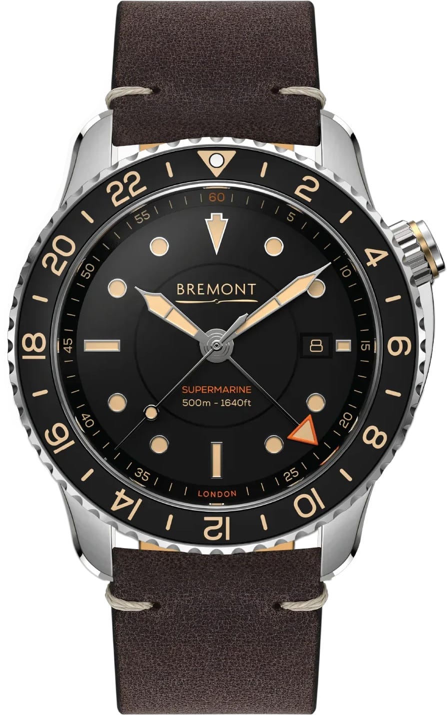 Encased in a robust 43mm stainless steel Bremont Trip-Tick case with a domed anti-reflective, scratch resistant sapphire crystal and 24 hour uni-directional rotating bezel. Powered by a modified calibre BE-932AV automatic movement, chronometer rated to ISO 3159 standard.