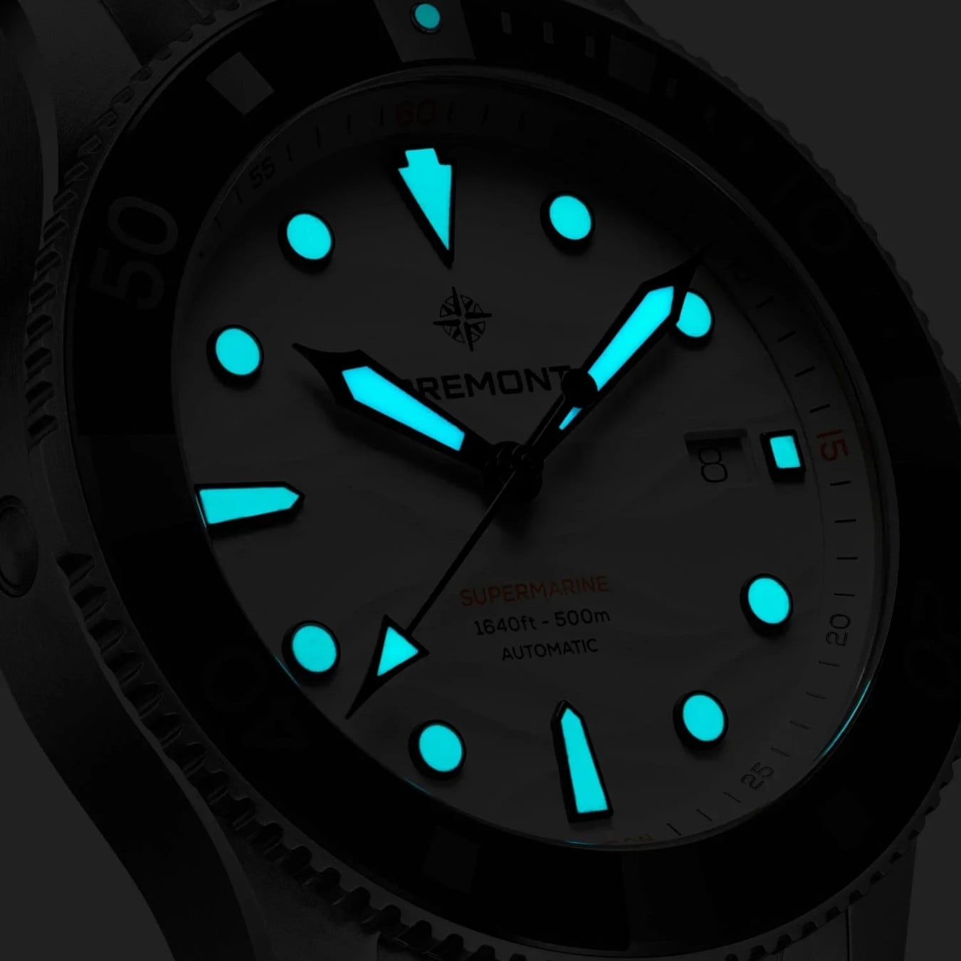 Designed for maximum clarity in challenging environments, the Supermarine 500m features applied indexes and sword hands filled with latest generation Super-LumiNova®. Whether diving at depth or navigating low light, the bold, high-contrast layout ensures instant readability.