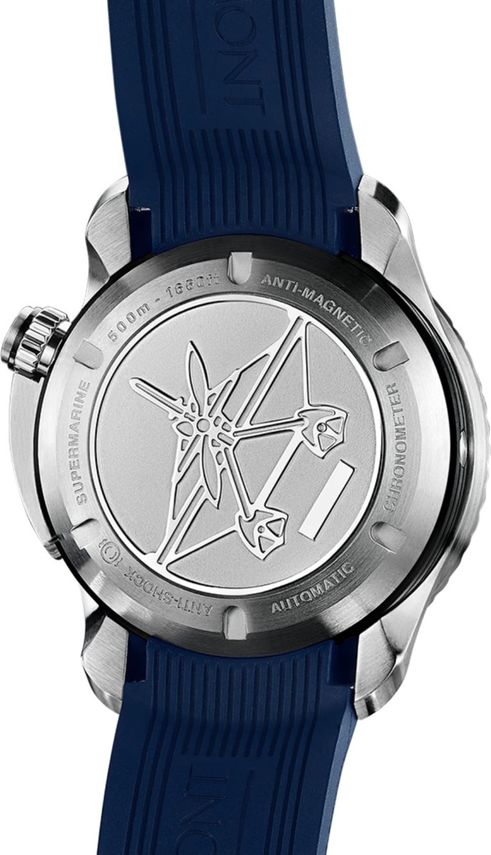 - This timepiece features a 43mm steel case paired with a high quality rubber strap. It showcases a distinctive blue dial and is powered by a precise automatic winding movement. The watch is designed with a water resistance of up to 500m.