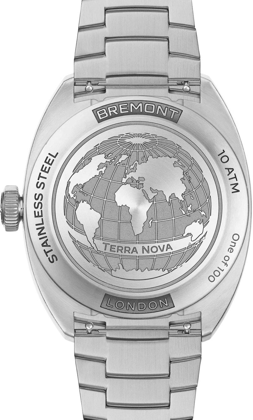 The watch’s dial features oversized numerals cut in full-block Super-LumiNova® for increased legibility in low light conditions. The Super-LumiNova® application is continued across the indexes on the broken railroad minute track and vintage inspired hands. The closed case back is engraved with a unique design featuring a charted map of the world and the words ‘Terra Nova’.