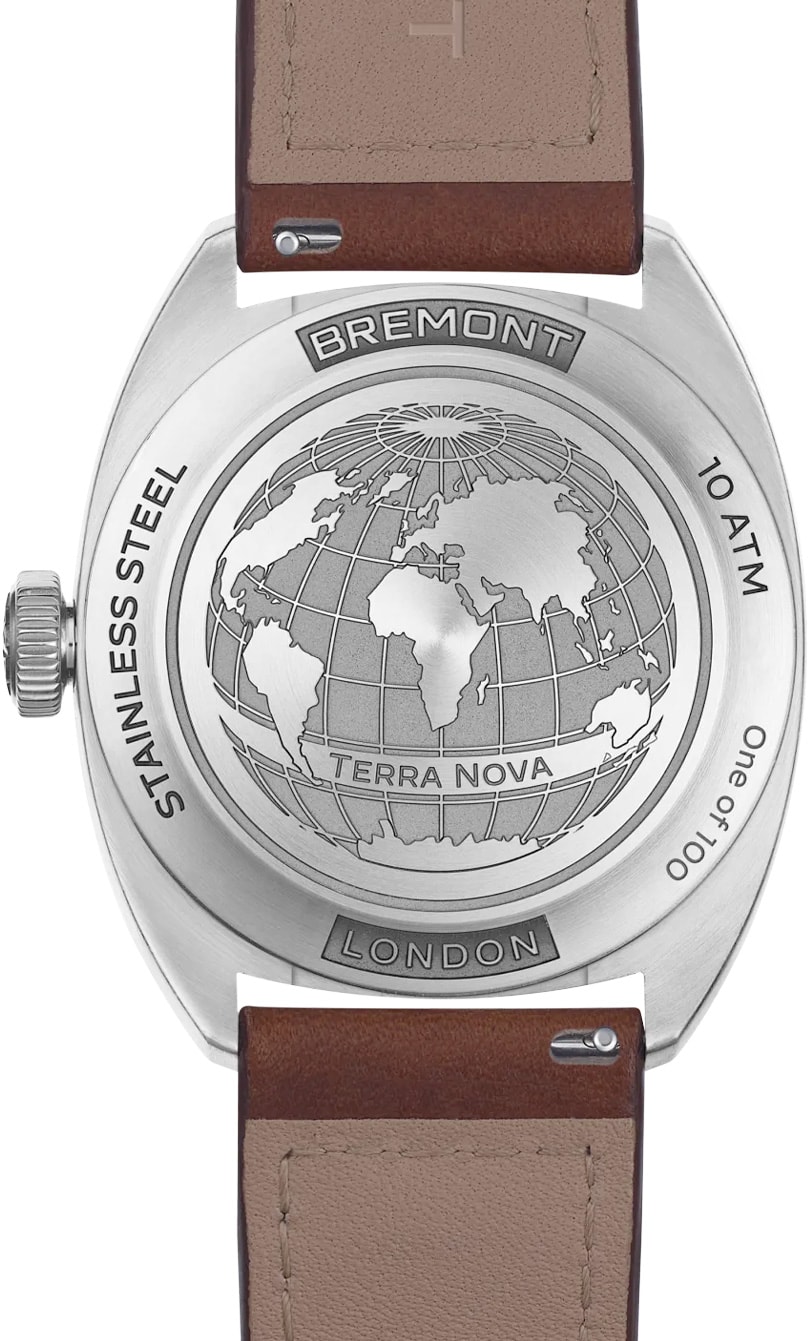 The watch’s dial features oversized numerals cut in full-block Super-LumiNova® for increased legibility in low light conditions. The Super-LumiNova® application is continued across the indexes on the broken railroad minute track and vintage inspired hands. The closed case back is engraved with a unique design featuring a charted map of the world and the words ‘Terra Nova’.