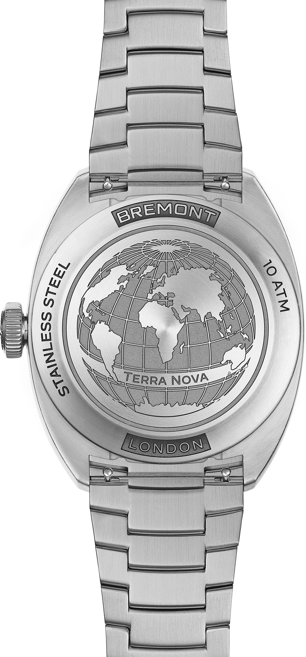The watch’s dial features oversized numerals cut in full-block Super- LumiNova® for increased legibility in low light conditions. The Super-LumiNova® application is continued across the indexes on the broken railroad minute track and vintage inspired hands. The closed case back is engraved with a unique design featuring a charted map of the world and the words ‘Terra Nova’.