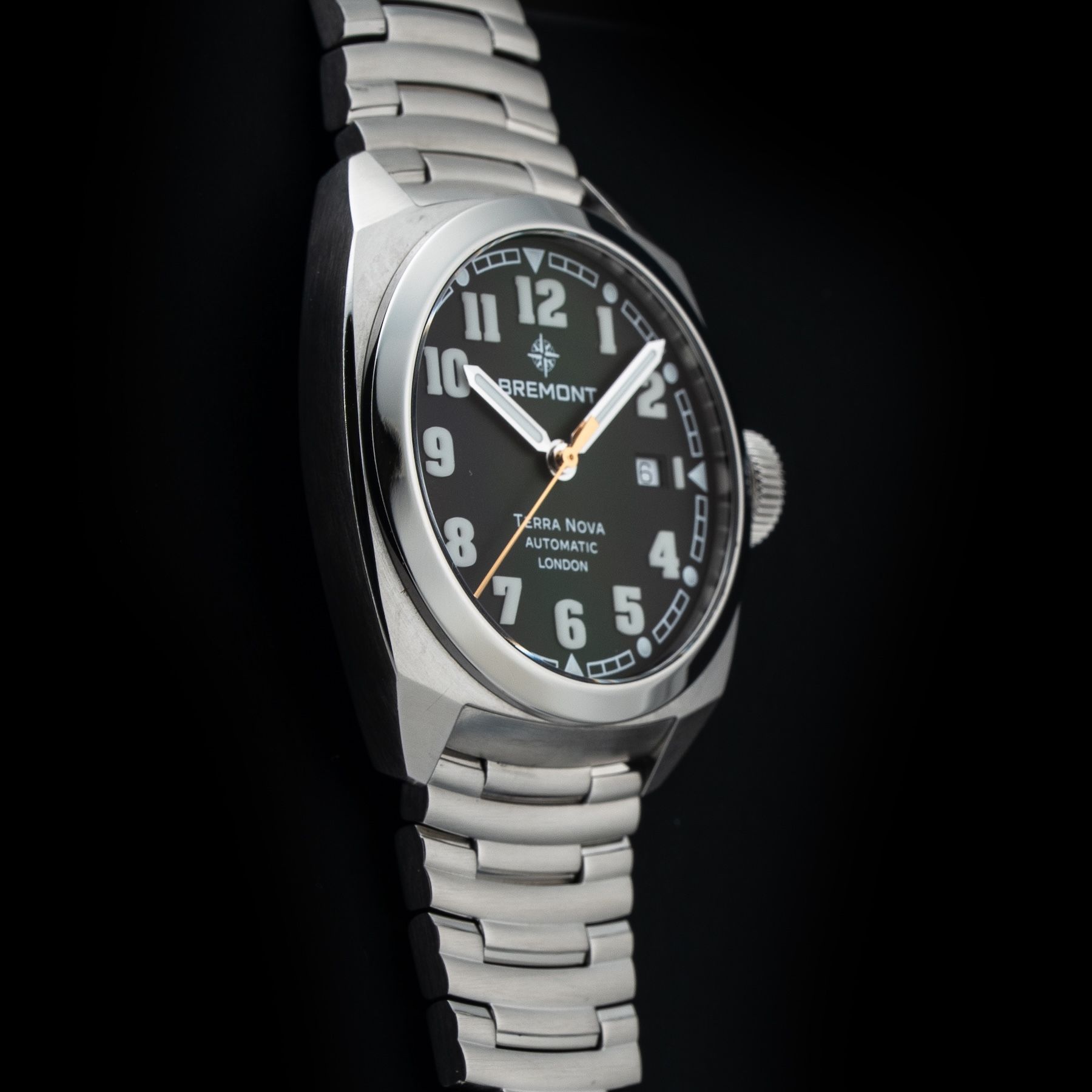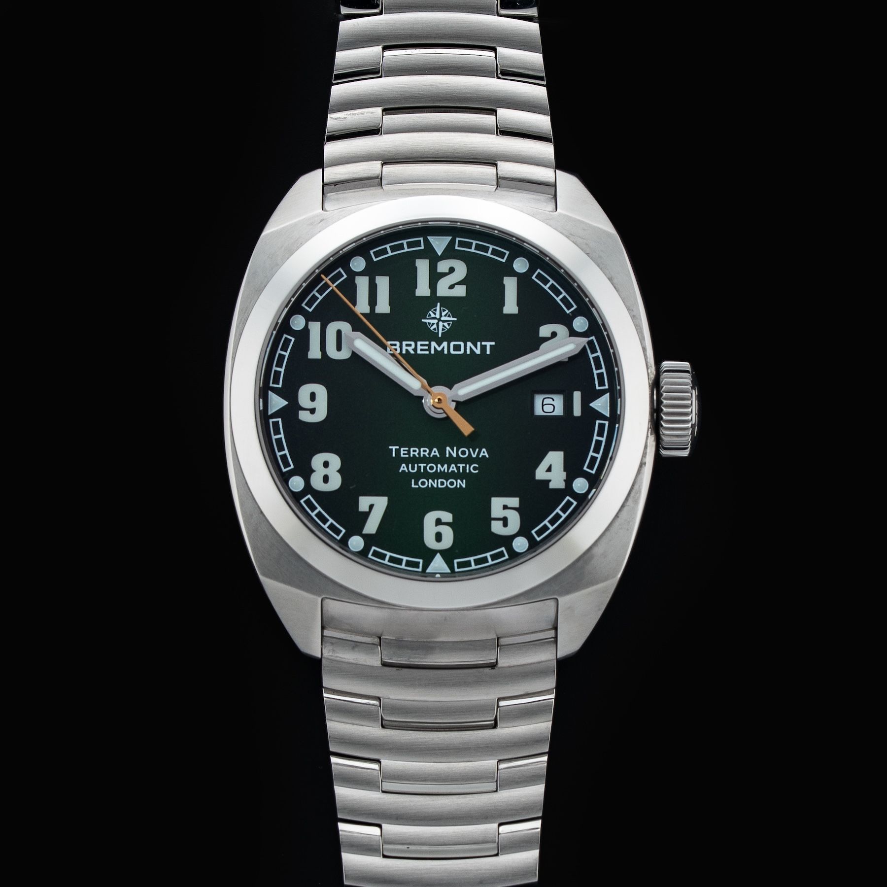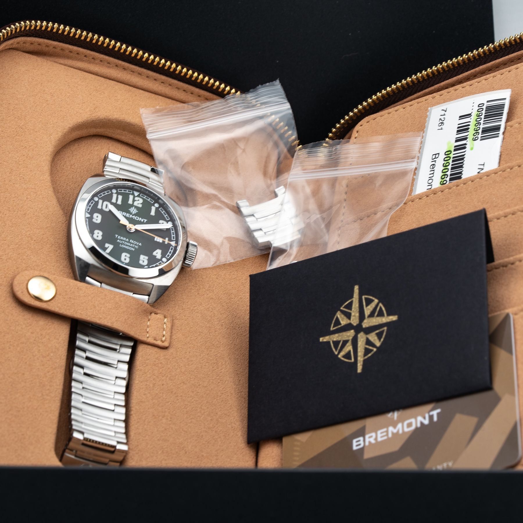 Bremont Terra Nova 40.5 Date “Green Dial on Bracelet”, TN40‑DT‑SS‑GN‑B. 904L stainless steel geometric cushion case on a matching quick-release steel bracelet with folding clasp. Powered by the modified Calibre BE‑36AE (11 1/2’’’) automatic movement with 26 jewels and a 38‑hour power reserve. Features central hours, minutes, running seconds, and a date window at 3 o’clock. Gradient green metal dial with full‑block 3D Super‑LumiNova® Arabic numerals and vintage-style hands. Domed AR-coated sapphire crystal, stainless steel screw‑down caseback engraved with a world map and “Terra Nova”. Oversized crown adorned with Bremont’s “Wayfinder” logo. Water resistant to 100 meters. Diameter: 40.5 mm; estimated thickness around 11 mm. Complete set. Warranty dated 8/14/24.Please note, the photos shown are of the actual watch you will receive.