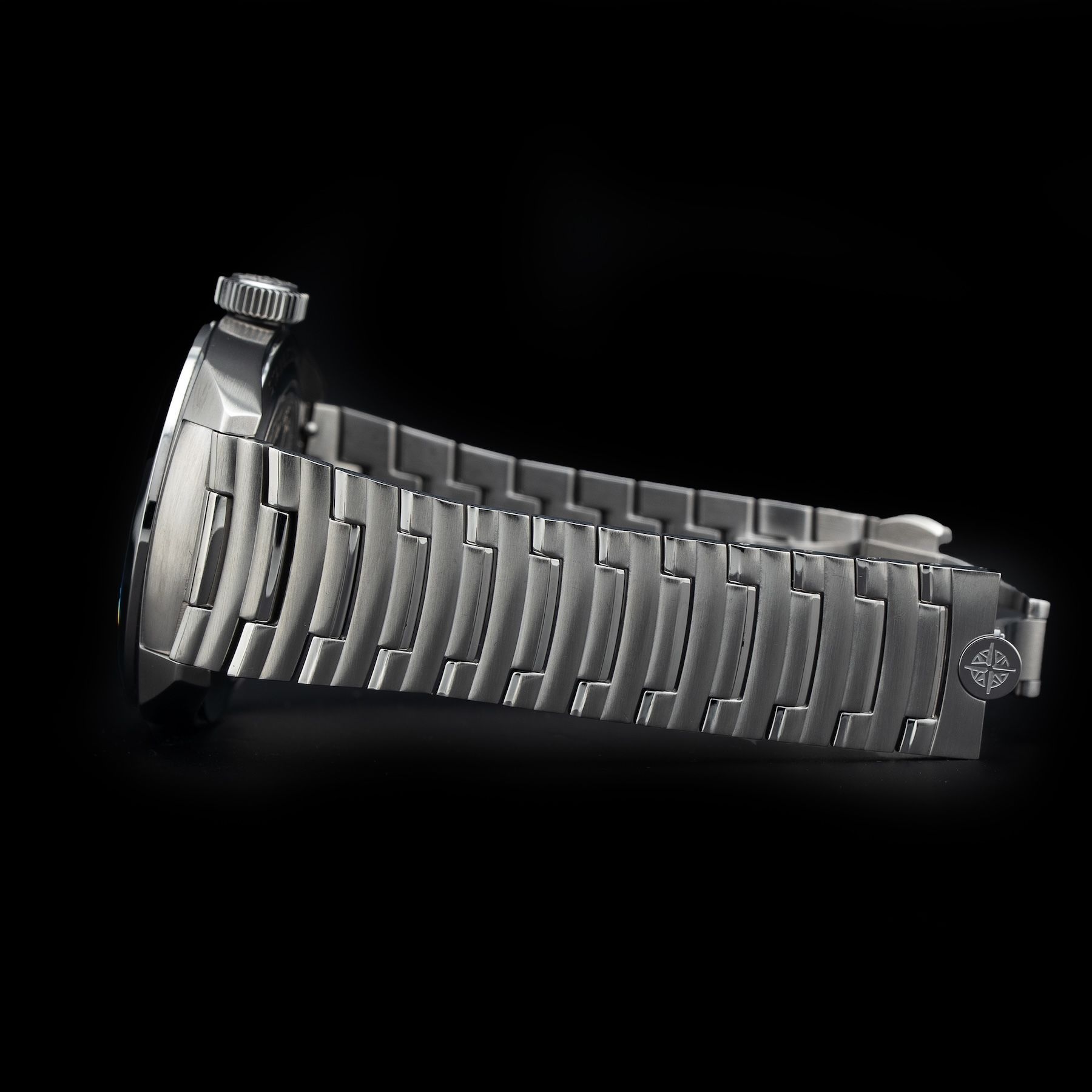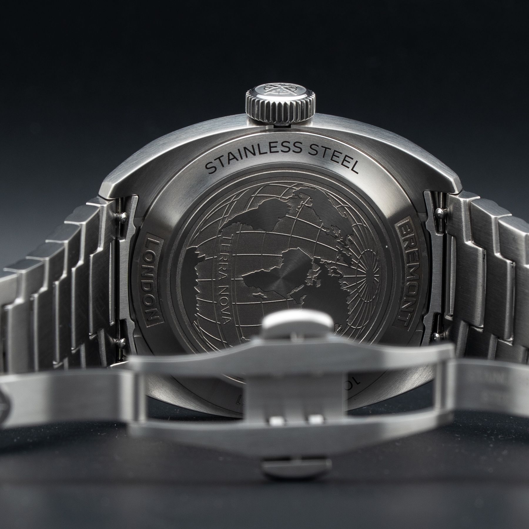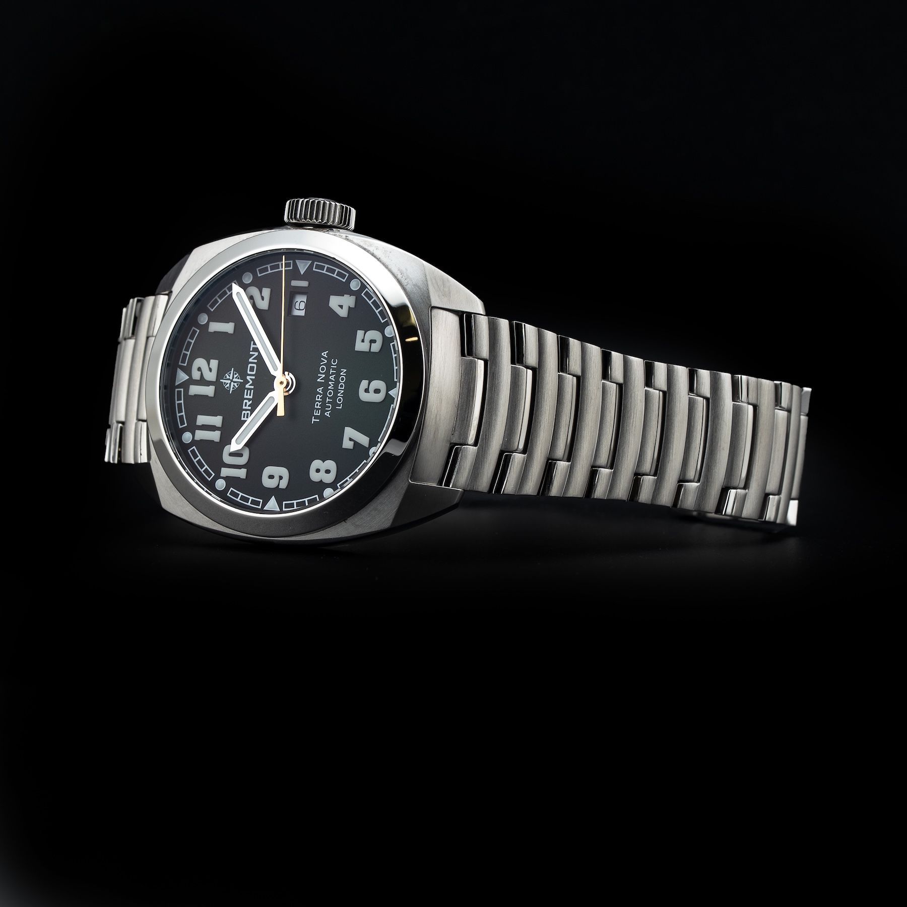 Bremont Terra Nova 40.5 Date “Green Dial on Bracelet”, TN40‑DT‑SS‑GN‑B. 904L stainless steel geometric cushion case on a matching quick-release steel bracelet with folding clasp. Powered by the modified Calibre BE‑36AE (11 1/2’’’) automatic movement with 26 jewels and a 38‑hour power reserve. Features central hours, minutes, running seconds, and a date window at 3 o’clock. Gradient green metal dial with full‑block 3D Super‑LumiNova® Arabic numerals and vintage-style hands. Domed AR-coated sapphire crystal, stainless steel screw‑down caseback engraved with a world map and “Terra Nova”. Oversized crown adorned with Bremont’s “Wayfinder” logo. Water resistant to 100 meters. Diameter: 40.5 mm; estimated thickness around 11 mm. Complete set. Warranty dated 8/14/24.Please note, the photos shown are of the actual watch you will receive.