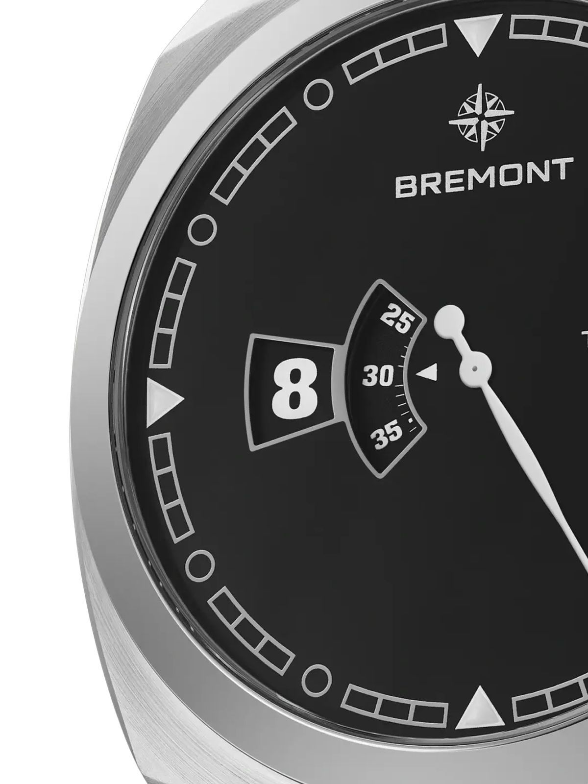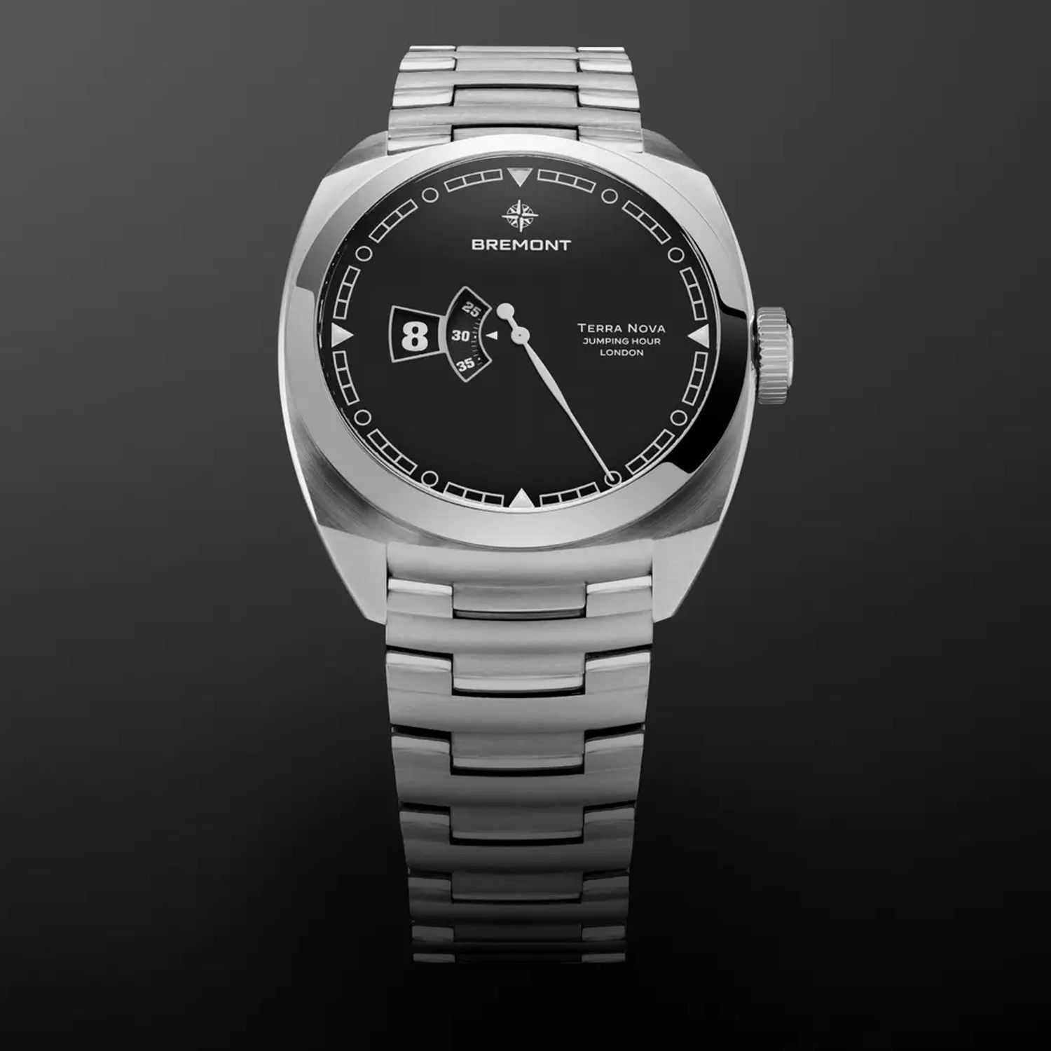 The Terra Nova Jumping Hour in 904L stainless steel brings a refined and contemporary twist to Bremont’s modern field watch design. Housed in a polished and brushed 40.5mm 904L stainless steel cushion-shaped Terra Nova case, it blends vintage inspiration with cutting-edge mechanics. Its gloss black dial features clean, offset apertures for the hour and minute displays, offering a left-to-right flow that enhances both balance and readability.